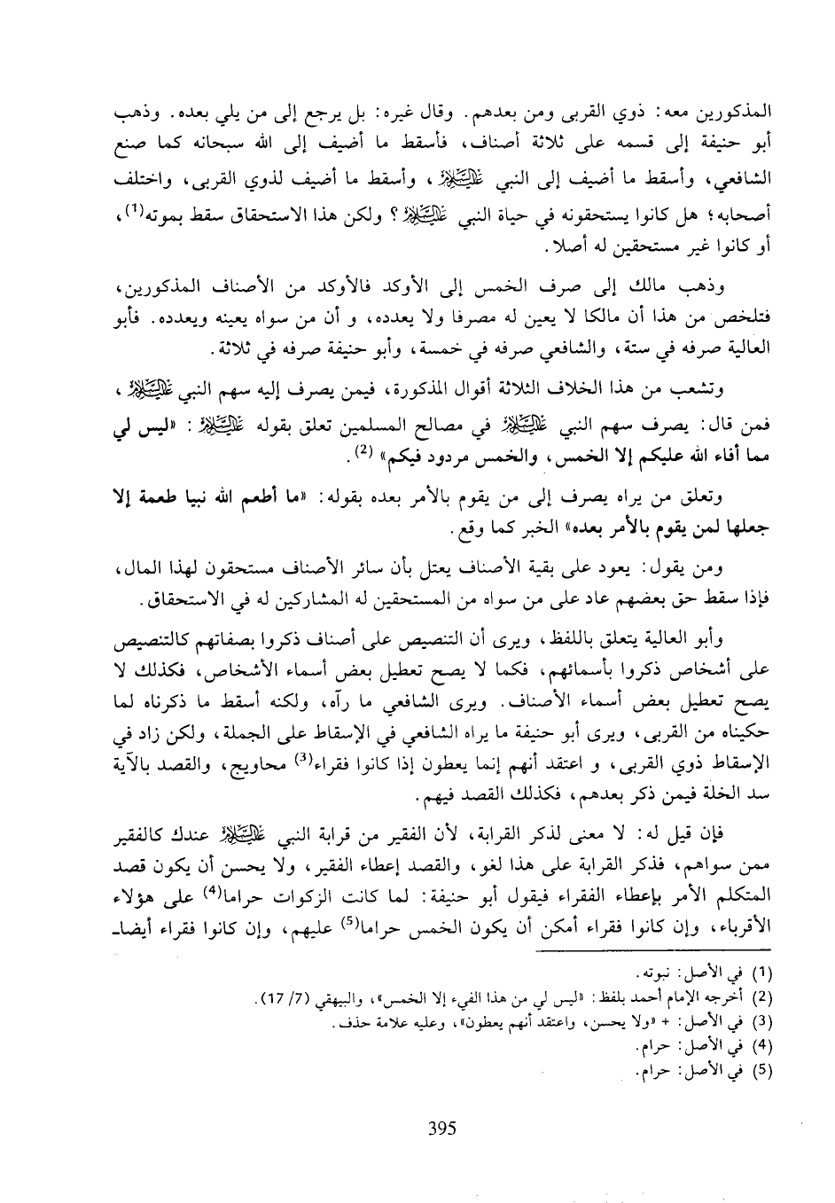 وتشعب من هذا الخلاف الثلاثة أقوال المذكورة، فيمن يصرف إليهم سهم النبي عليه السلام، فمن قال: يصرف سهم النبي عليه السلام في مصالح المسلمين تعلق بقوله عليه السلام: "ليس ليس مما أفاء الله عليكم إلا الخمس، والخمس مردود فيكم".