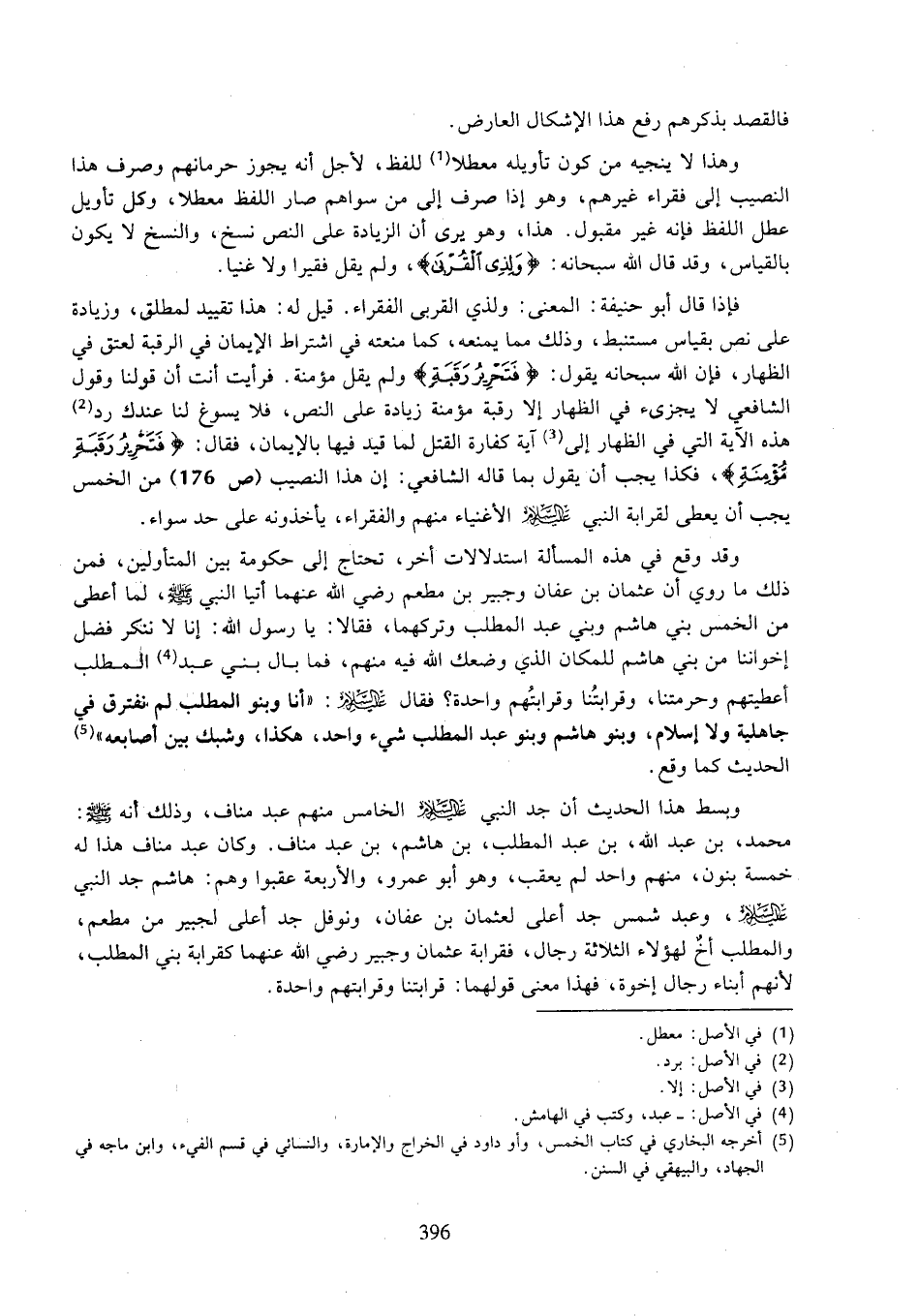وقد وقع في هذه المسألة استدلالات أخر، تحتاج إلى حكومة بين المتأولين، فمن ذلك ما روي أن عثمان بن عفان وجبير بن مطعم رضي الله عنهما أتيا النبي صلى الله عليه وسلم، لما أعطى من الخمس بني هاشم وبني عبد المطلب وتركهما، فقالا: يا رسول الله: إنا لا ننكر فضل إخواننا من بني هاشم للمكان الذي وضعك الله فيه منهم، فما بال بني عبد المطلب أعطيتهم وحرمتنا، وقرابتنا وقرابتهم واحدة؟ فقال عليه السلام: "أنا وبنو المطلب لم نفترق في جاهلية ولا إسلام، وبنو هاشم وبنو عبد المطلب شيء واحد، هكذا، وشبك بين أصابعه" الحديث كما وقع.