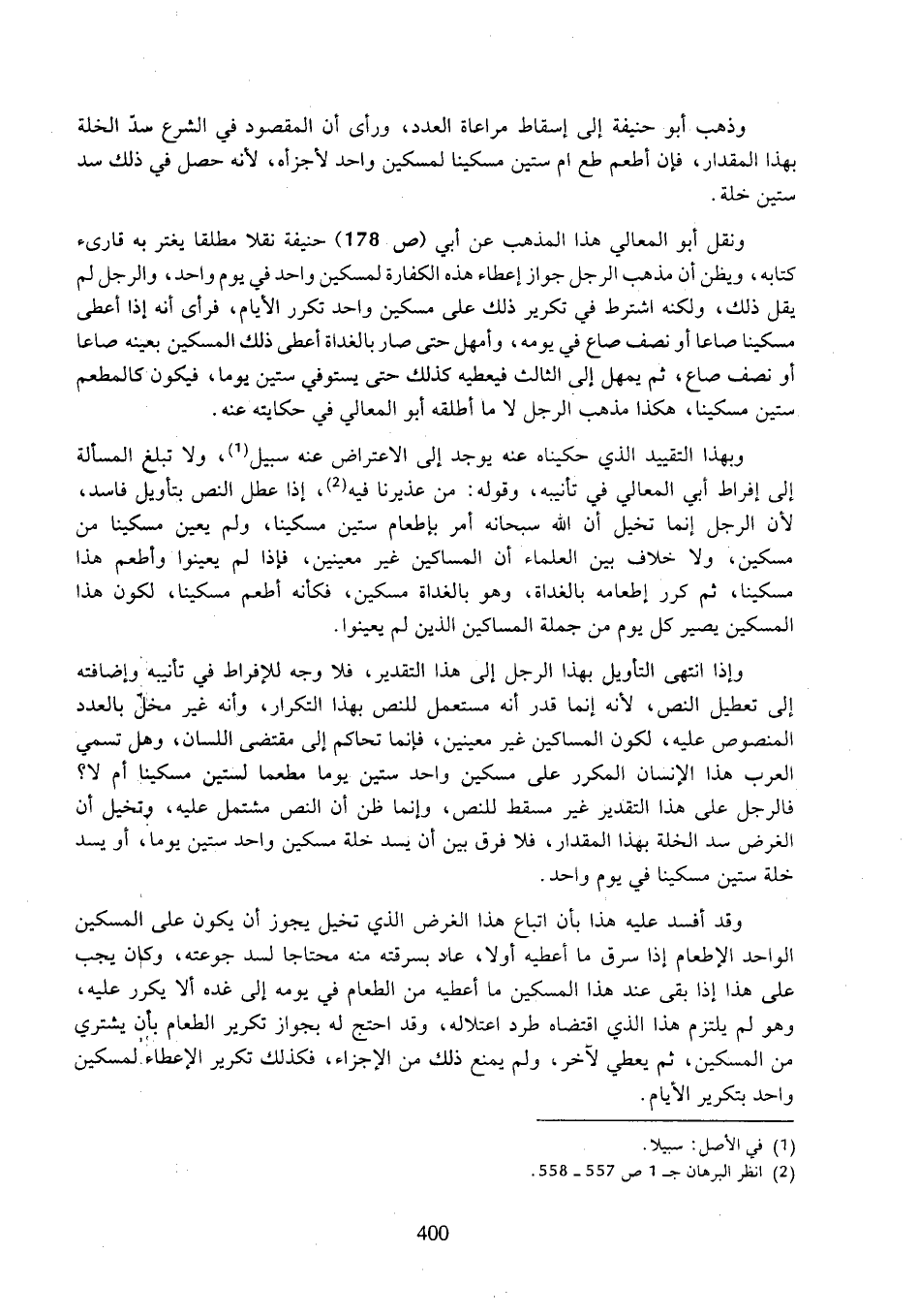 ونقل أبو المعالي هذا المذهب عن أبي (ص ١٧٨) حنيفة نقلا مطلقا يغتر به قارئ كتابه، ويظن أن مذهب الرجل جواز إعطاء هذه الكفارة لمسكين واحد في يوم واحد، والرجل لم يقل ذلك، ولكنه اشترط في تكرير ذلك على مسكين واحد تكرر الأيام، فرأى أنه إذا أعطى مسكينا صاعا أو نصف صاغ في يومه، وأمهل حتى صار بالغداة أعطى ذلك المسكين بعينه صاعا أو نصف صاع في يومه، وأمهل حتى صار بالغداة أعطى ذلك المسكين بعينه صاعا أو نصف صاع، ثم يمهل إلى الثالث فيعطيه كذلك حتى يستوفي ستين يوما، فيكون كالمطعم ستين مسكينا، هكذا مذهب الرجل لا ما أطلقه أبو المعالي في حكايته عنه.