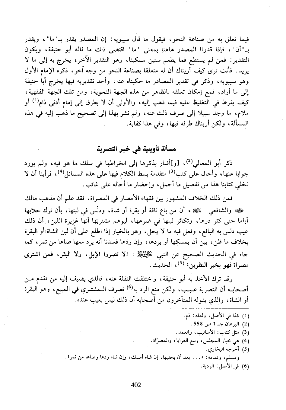 فيما تعلق به من صناعة النحو، فيقول ما قاله سيبويه: إن المصدر يقدر بـ "ما"، ويقدر بـ "أن"، فإذا قدرنا المصدر هاهنا بمعنى "ما" اقتضى ذلك ما قاله أبو حنيفة، ويكون التقدير: فمن لم يستطع فما يطعم ستين مسكينا، وهو التقدير الآخر، يخرج به إلى ما لا يريد. فأنت ترى كيف أريناك أن له متعلقا بصناعة النحو م وجه آخر، ذكره الإمام الأول وهو سيبويه، وذكر في تقدير المصادر ما حكيناه عنه، وأحد تقديريه فيها يخرج أبا حنيفة إلى ما أراد، فمع إمكان تعلقه بالظاهر من هذه الجهة النحوية، ومن تلك الجهة الفقهية، كيف يفرط في التغليظ عليه فيما ذهب إليه، والأولى أن لا يطرق إلى إمام أدنى ذام أو ملام، ما وجد سبيلا إلى صرف ذلك عنه، ولم نشر بهذا إلى تصحيح ما ذهب إليه في هذه المسألة، ولكن أريناك طرقه فيها، وفي هذا كفاية.
