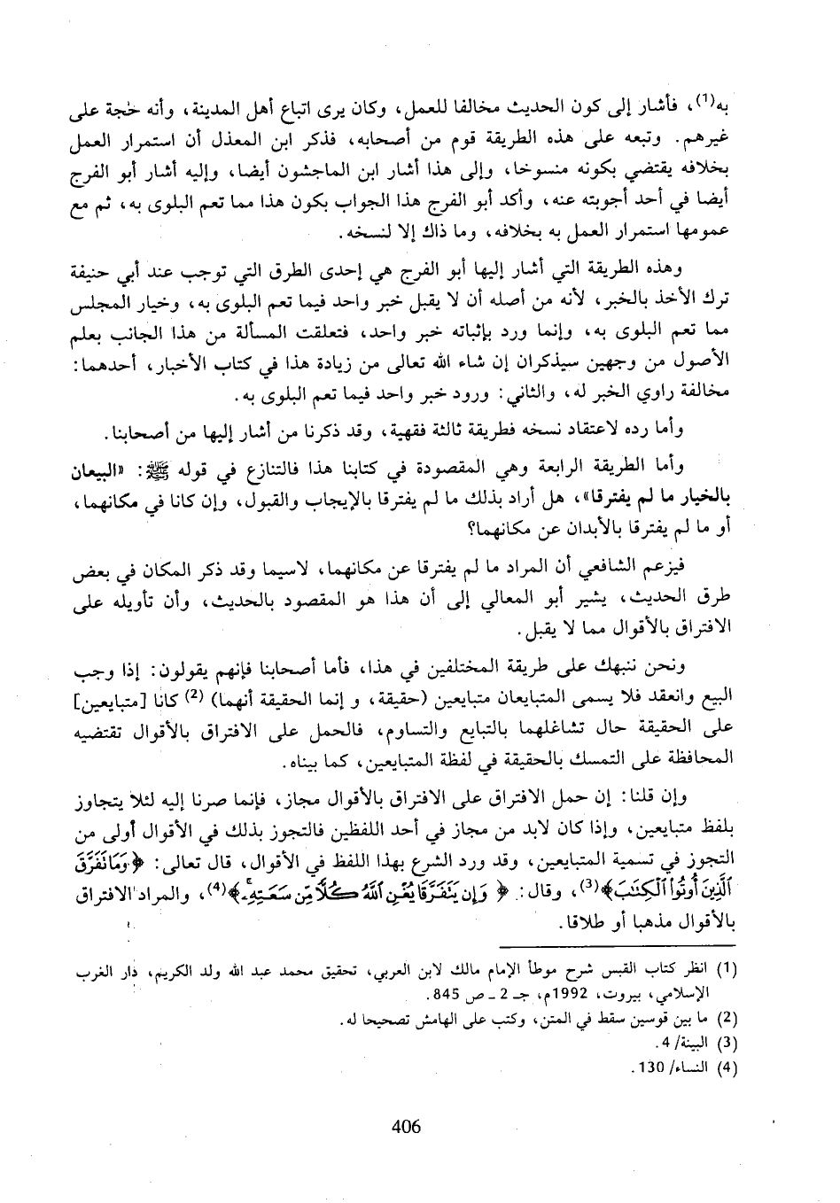 وأما الطريقة الرابعة وهي المقصودة في كتابنا هذا فالتنازع في قوله صلى الله عليه وسلم: "البيعان بالخيار ما لم يفترقا"، هل أراد بذلك ما لم يفترقا بالإيجاب والقبول، وإن كانا في مكانهما، أو ما لم يفترقا بالأبدان عن مكانهما؟