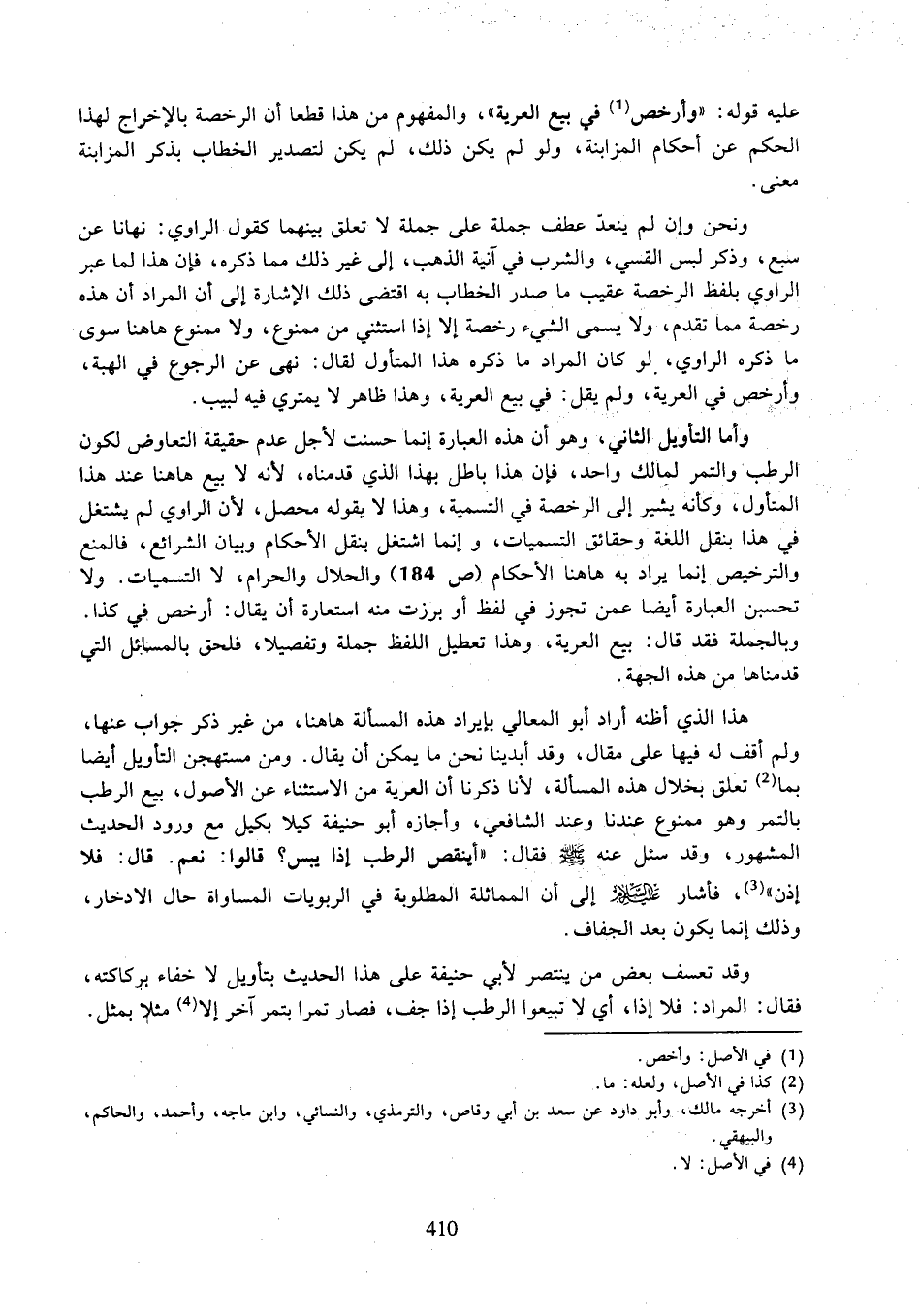وأما التأويل الثاني، وهو أن هذه العبارة إنما حسنت لأجل عدم حقيقة التعاوض لكون الرطب والتمر لمالك واحد، فإن هذا باطل بهذا الذي قدمناه، لأنه لا بيع هاهنا عند هذا المتأول، وكأنه يشير إلى الرخصة في التسمية، وهذا لا يقوله محصل، لأن الراوي لم يشتغل في هذا بنقل اللغة وحقائق التسميات، وإنما اشتغل بنقل الأحكام وبيان الشرائع، فالمنع والترخيص إنما يراد به هاهنا الأحكام (ص ١٨٤) والحلال والحرام، لا التسميات. ولا تحسبن العبارة أيضا عمن تجوز في لفظ أو برزت منه استعارة أن يقال: أرخص في كذا. وبالجملة فقد قال: بيع العرية، وهذا تعطيل اللفظ جملا وتفصيلا، فلحق بالمسائل التي قدمناها من ههذ الجهة.