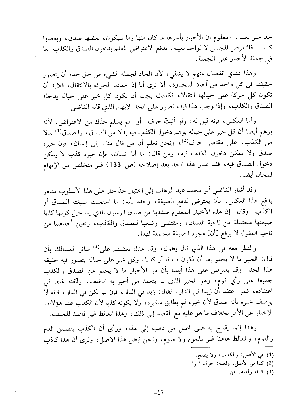 وأما العكس، فإنه قيل له: ولو أثبت حرف "أو" لم يسلم حدك من الاعتراض، لأنه يوهم أيضا أن كل خبر على حياله يوهم دخول الكذب فيه بدلا من الصدق، والصدق بدلا من الكذب، على مقتضى حرف، ونحن نعلم أن من قال مناة إني إنسان، فإن خبره صدق ولا يمكن دخول الكذب فيه، ومن قال: ما أنا إنسان، فإن خبره كذب لا يمكن دخول الصدق فيه، فقد صار هذا الحد بعد إصلاحه (ص ١٨٨) غير متخلص من الإيهام لمحال أيضا.
