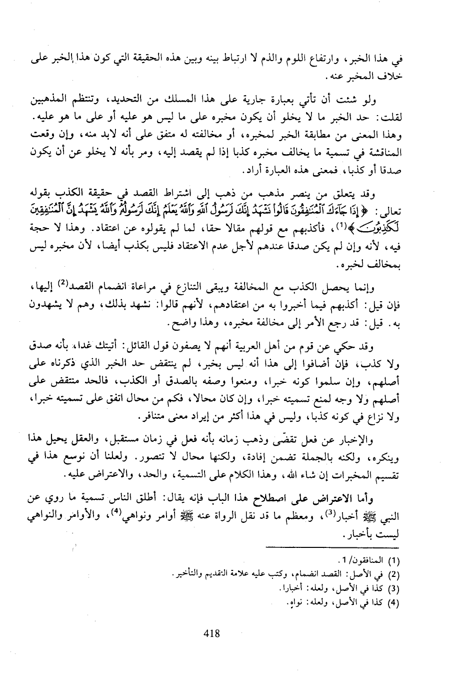 وإنما يحصل الكذب مع المخالفة ويبقى التنازع في مراعاة انضمام القصد إليها، فإن قيل: أكذبهم فيما أخبروا به من اعتقادهم، لأنهم قالوا: نشهد بذلك، وهم لا يشهدون به. قيل: قد رجع الأمر إلى مخالفة مخبره، وهذا واضح.