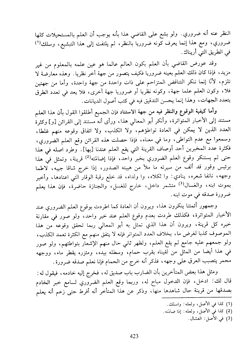 وأما كيفية الوقوع والنظر فيه من جهة الاستناد فإن الجميع أطلقوا القول بأن هذا العلم مستند إلى الأخبار المتواترة، وأنكر أبو المعالي هذا، ورأى أنه مستند إلى القرائن [و] وكثرة العدد الذين لا يمكن في العادة تواطؤهم، ولا الكذب، ولا اتفاق وقوعه منهم غلطا، وسمعوا مع عدم التواطئ، وما في معناه، فإذا حصلت هذه القرائن وقع العلم الضروري، فكثرة عدد المخبرين أحد أوصاف القرينة التي يقع العلم عندنا [بها]. وطرد أصله في هذا حتى لم يستنكر وقوع العلم الضروري بخبر واحد، فإذا إضامته قرينة، وتمثل في هذا برئيس وقور قد ألف من سيرته ما ملأ من هيبته الصدور، إذا خرج شاقا جيبه، لاطما وجهه، ناتفا شعره، ينادي: وا ثكلاه، وا ولداه، قد خلع رقبة الوقار التي اعتادها، وأخبر بموت ابنه، والغسال متشمر داخل، خارج للغسل، والجنازة حاضرة، فإن هذا يعلم ضرورة صدقه في موت ابنه.