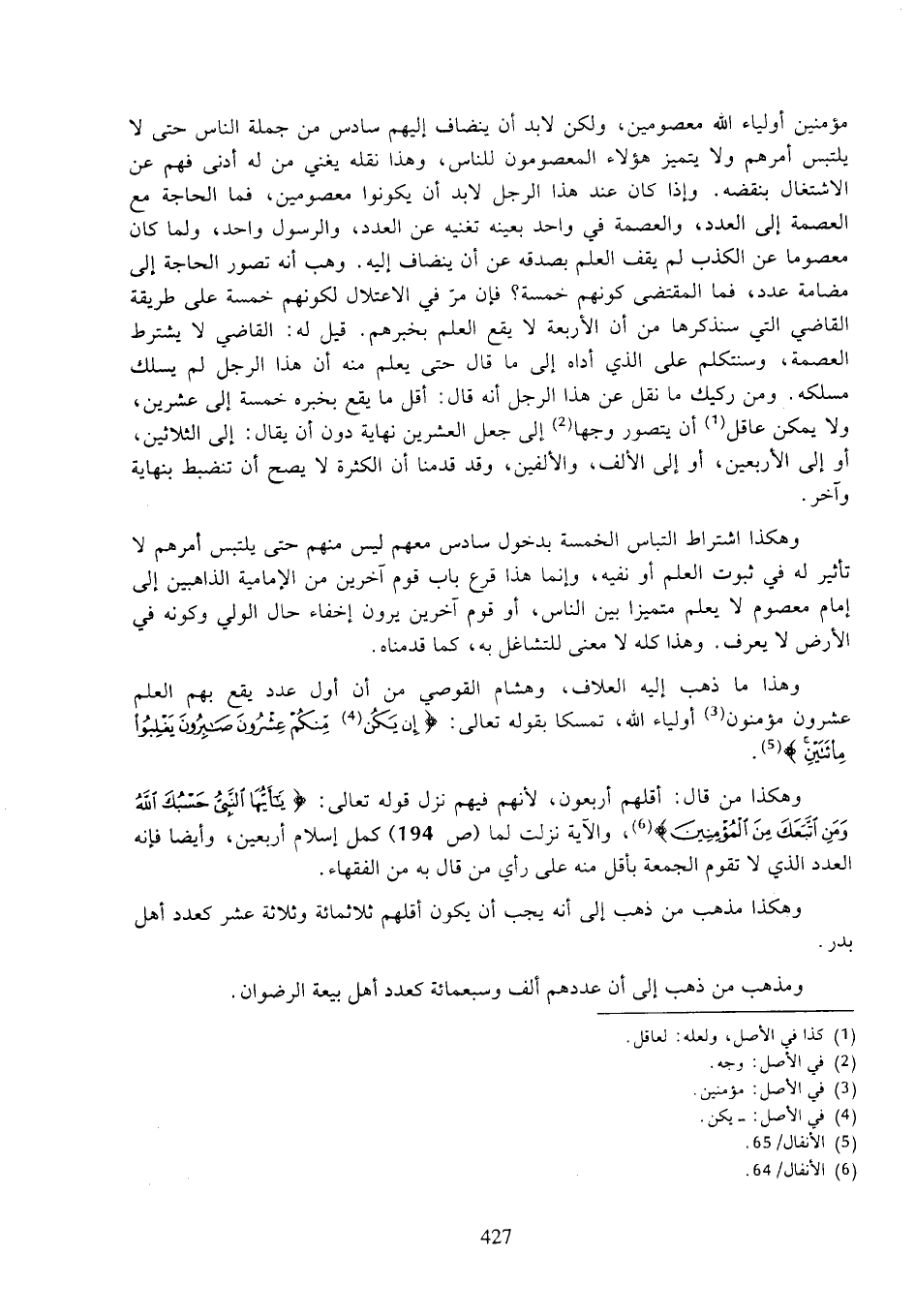 مؤمنين أولياء الله معصومين، ولكن لابد أن ينضاف إليهم سادس من جملة الناس حتى لا يلتبس أمرهم ولا يتميز هؤلاء المعصومون للناس، وهذا نقله يغني من له أدنى فهم عن الاشتغال بنقضه. وإذا كان عند هذا الرجل لابد أن يكونوا معصومين، فما الحاجة مع العصمة إلى العدد، والعصمة في واحد بعينه تغنيه عن العدد، والرسول واحد، ولما كان معصوما عن الكذب لم يقف العلم بصدقه عن أن ينضاف إليه. وهب أنه تصور الحاجة إلى مضامة عدد، فما المقتضى كونهم خمسة؟ فإن مر في الاعتلال لكونهم خمسة على طريقة القاضي التي سنذكرها من أن الأربعة لا يقع العلم بخبرهم. قيل له: القاضي لا يشترط العصمة، وسنتكلم على الذي أداه إلى ما قال حتى يعلم منه أنه هذا الرجل لم يسلك مسلكه. ومن ركيك ما نقل عن هذا الرجل أنه قال: أقل ما يقع بخبره خمسة إلى عشرين، ولا يمكن عاقل أن يتصور وجها إلى جعل العشرين نهاية دون أن يقال: إلى الثلاثين، أو إلى الأربعين، أو إلى الألف، والألفين، وقد قدمنا أن الكثرة لا يصح أن تنضبط بنهاية وآخر.