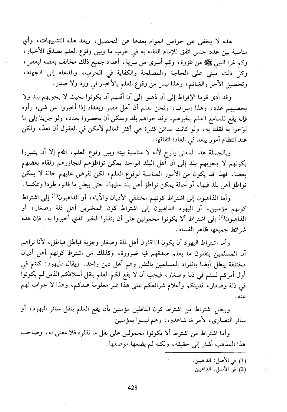 وأما اشتراط اليهود أن يكون الناقلون أهل ذلة وصغار وجزية فباطل فباطل، لأنا نراهم أن المسلمين ينقلون ما يعلم صدقهم فيه ضرورة، وكذلك من اشترط كونهم أهل أديان مختلفة يبطل ايضا بانفراد المسلمين بالنقل وهم أهل دين واحد. ويقال لليهود: كنتم في أول أمركم لستم في ذلة وصغار، فيجب أن لا يقع لكم العلم بنقل أسلافكم الذين لم يكونوا في ذلة وصغار، فدينكم وأعلام شرائعكم على هذا غير معلوم عندكم، وهذا لا جواب لهم عنه.