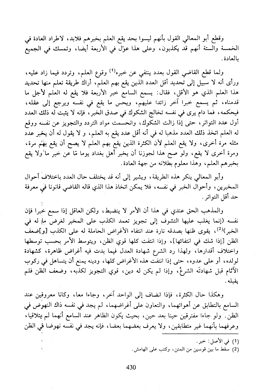 وأبو المعالي ينكر هذه الطريقة، ويشير إلى أنه قد يختلف حال العدد باختلاف أحوال المخبرين، وأحوال الخبر في نفسه، فلا يمكن اتخاذ هذا الذي قاله القاضي قانونا في معرفة حد أقل التواتر.