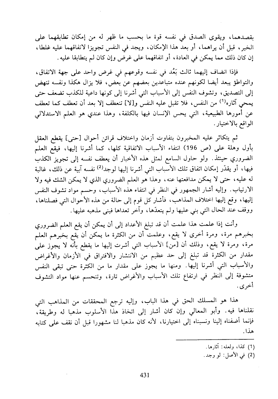 وأنت إذا علمت هذا علمت أن قد تبلغ الأعداد إلى أن يمكن أن يقع العلم الضروري بخبرهم مرة، ومرة أخرى لا يقع، وعلمت أن من الكثرة ما يمكن أن يقع بخبرهم العلم مرة، ومرة لا يقع، وذلك أن [من] الأسباب التي أشرت إليها ما يقطع بأنه لا يجوز على مقدار من الكثرة قد تبلغ إلى حد عظيم من الانتشار والافتراق في الأزمان والأغراض والأسباب التي أشرنا إليها. ومنها ما يجوز على مقدار ما من الكثرة حتى تبقى النفس متشوقة إلى النظر في ارتفاع تلك الأسباب والأغراض تارة، وتنحسم عنها مواد التشوف أخرى.
