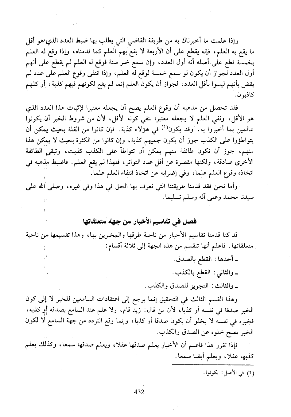 فقد تحصل من مذهبه أن وقوع العلم يصح أن يجعله معتبرا لإثبات هذا العدد الذي هو الأقل، ونفي العلم لا يجعله معتبرا لنفي كونه الأقل، لأن من شروط الخبر أن يكونوا عالمين بما أخبروا به، وقد يكون في هؤلاء كذبة. فإن كانوا من القلة بحيث يمكن أن يتواطؤوا على الكذب جوز أن يكون جميعهم كذبة، وإن كانوا من الكثرة بحيث لا يمكن هذا منهم، جوز أن تكون طائفة منهم يمكن أن تتواطأ على الكذب كذبت، وتبقى الطائفة الأخرى صادقة، ولكنها مقصرة عن أقل عدد التواتر، فلهذا لم يقع العلم. فاضبط مذهبه في اتخاذه وقوع العلم علما، وفي إضرابه عن اتخاذ انتفاء العلم علما.