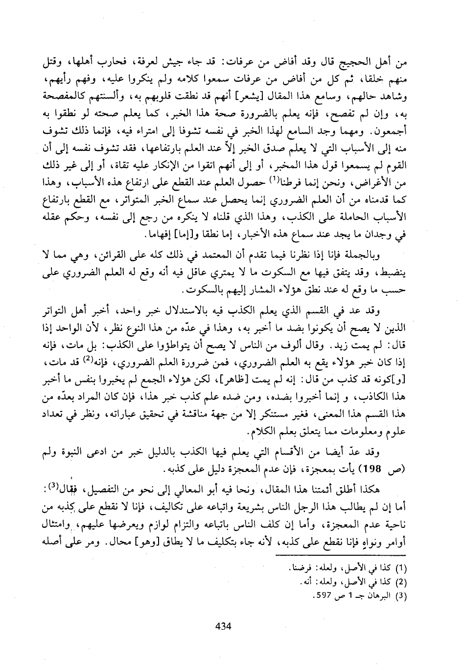 من أهل الحجيج قال وقد أفاض من عرفات: قد جاء جيش لعرفة، فحارب أهلا، وقتل منهم خلقا، ثم كل من أفاض من عرفات سمعوا كلامه ولم ينكروا عليه، وفهم رأيهم، وشاهد حالهم، وسامع هذا المقال [يشعر] أنهم قد نطقت قلوبهم به، وألسنتهم كالمفصحة به، وإن لم تفصح، فإنه يعلم بالضرورة صحة هذا الخبر، كما يعلم صحته لو نطقوا به أجمعون. ومهما وجد السامع لهذا الخبر في نفسه تشوفا إلى امتراء فيه، فإنما ذل تشوف منه إلى الأسباب التي لا يعلم صدق الخبر إلا عند العلم بارتفاعها، فقد تشوف نفسه إلى أن القوم لم يسمعوا قول هذا المخبر، أو إلى أنهم اتقوا من الإنكار عليه تقاة، أو إلى غير ذلك من الأغراض، ونحن إنما فرطنا حصول العلم عند القطع على ارتفاع هذه الأسباب، وهذا كما قدمناه من أن العلم الضروري إنما يحصل عند سماع الخبر المتواتر، مع القطع بارتفاع الأسباب الحاملة على الكذب، وهذا الذي قلناه لا ينكره من رجع إلى نفسه، وحكم عقله في وجدان ما يجد عند سماع هذه الأخبار، إما نطقا و [إما] إفهاما.