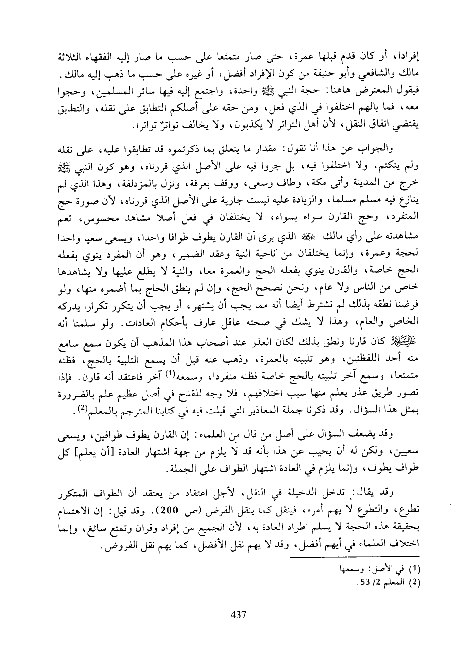 والجواب عن هذ أنا نقول: مقدار ما يتعلق بما ذكرتموه قد تطابقوا عليه، على نقله ولم ينكتم، ولا اختلفوا فيه، بل جروا فيه على الأصل الذي قررناه، وهو كون النبي صلى الله عليه وسلم خرج من المدينة وأتى مكة، وطاف وسعى، ووقف بمعرفة، ونزل بالمزدلفة، وهذا الذي لم ينازع فيه مسلم مسلما، والزيادة عليه ليست جارية على الأصل الذي قررناه، لأن صورة حج المنفرد، وحج القارن سواء بسواء، لا يختلفان في فعل أصلا مشاهد محسوس، تعم مشاهدته على رأي مالك رضي الله عنه الذي يرى أن القارن يطوف طوافا واحدا، ويسعى سعيا واحدا لحجة وعمرة، وإنما يختلفان من ناحية النية وعقد الضمير، وهو أن المفرد ينوي بفعله الحج خاصة، والقارن ينوي بفعله الحج والعمرة معا، والنية لا يطلع عليها ولا يشاهدها خاص من الناس ولا عام، ونحن نصحح الحج، وإن لم ينطق الحاج بما أضمره منها، ولو فرضنا نطقه بذلك لم نشترط أيضا أنه مما يجب أن يشتهر، أو يجب أن يتكرر تكرارا يدركه الخاص والعام، وهذا لا يشك في صحته عاقل عارف بأحكام العادات. ولو سلمنا أنه عليه السلام كان قارنا ونطق بذلك لكان العذر عند أصحاب هذا المذهب أن يكون سمع سامع منه أحد اللفظتين، وهو تلبيته بالعمرة، وذهب عنه قبل أن يسمع التبية بالحج، فظنه متمتعا، وسمع آخر تلبيته بالحج خاصة فظنه منفردا، وسمعه آخر فاعتقد أنه قارن. فإذا تصور طريق عذر يعلم منها سبب اختلافهم، فلا وجه للقدح في أصل عظيم علم بالضرورة بمثل هذا السؤال. وقد ذكرنا جملة المعاذير التي قيلت فيه في كتابنا المترجم بالمعلم.