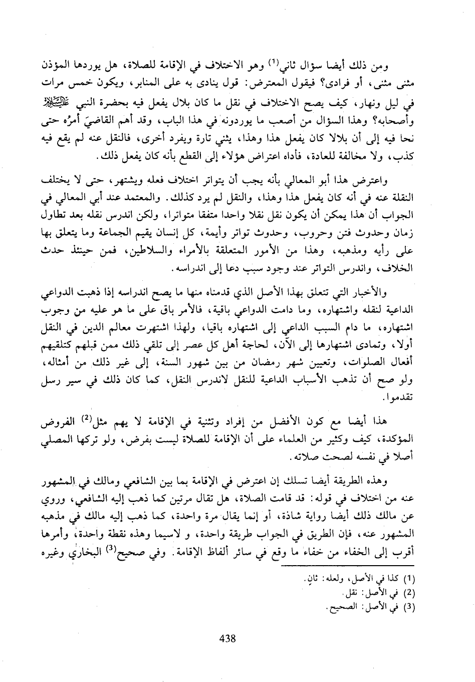 ومن ذلك أيضا سؤال ثاني وهو الاختلاف في الإقامة للصلاة، هل يوردها المؤذن مثنى مثنى، أو فرادى؟ فيقول المعترض: قول ينادي به على المنابر، ويكون خمس مرات في ليل ونهار، كيف يصح الاختلاف في نقل ما كان بلال يفعل فيه بحضرة النبي عليه السلام وأصحابه؟ وهذا السؤال من أصعب ما يوردونه في هذا الباب، وقد أهم القاضي أمره حتى نحا فيه إلى أن بلالا كان يفعل هذا وهذا، يثني تارة ويفرد أخرى، فالنقل عنه لم يقع فيه كذب، ولا مخالفة للعادة، فأداه اعتراض هؤلاء إلى القطع بأنه كان يفعل ذلك.