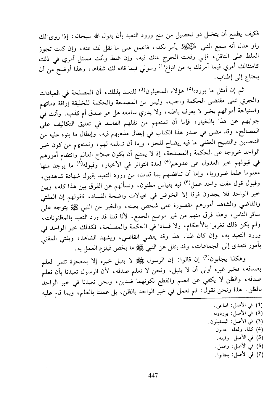 ثم إن أمثل ما يورده هؤلاء المحيلون للتعبد بذلك، أن المصلحة في العبادات والجري على مقتضى الحكمة واجب، وليس من المصلحة والحكمة للخليقة إراقة دمائهم واستباحة أموالهم بخبر لا يعرف باطنه، ولا يدري سامعه هل هو صدق أم كذب. وأنت في جوابهم عن هذا بالخيار، فإما أن تمنعهم من نقلهم الفاسد في تعليق التكاليف على المصالح، وقد مضى في صدر هذا الكتاب في إبطال مذهبهم فيه، وإبطال ما بنوه عليه من التحسين والتقبيح العقلي ما فيه إيضاح للحق، وإما أن تسلمه لهم، وتمنعهم من كون خبر الواحد خروجا عن الحكمة والمصلحة، إذ لا يمتنع أن يكون صلاح العالم وانتظام أمورهم في قبولهم خبر العدول عن عدوهم لعدة التواتر في الأخبار، وقبوله ما يوجد منها معلوما علما ضروريا، وإما أن تناقضهم بما قدمناه من ورود التعبد بقبول شهادة شاهدين، وقبول قول مفت واحد عمل فيه بقياس مظنون، وتسألهم عن الفرق بين هذا كله، وبين خبر الواحد فلا يجدون فرقا إلا الخوض في خيالات واضحة الفساد، كقولهم إن المفتي والقاضي والشاهد أمورهم مقصورة على شخص بعينه، والخبر عن النبي صلى الله عليه وسلم يتوجه على سائر الناس، وهذا فرق منهم من غير موضع الجمع، لأنا قلنا قد ورد التعبد بالمظنونات، ولم يكن ذلك تغريرا بالأحكام، ولا فسادا في الحكمة والمصلحة، فكذلك خبر الواحد في ورود التعبد به، وإن كان ظنا. هذا وقد يقضي القاضي، ويشهد الشاه، ويفتي المفتي بأمور تتعدى إلى الجماعات، وقد ينقل عن النبي صلى الله عليه وسلم ما يخص فيلزم العمل به.