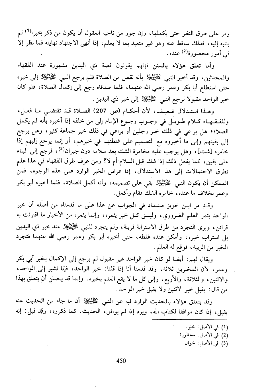 وهذا استدلال ضعيف، لأن أحكام (ص ٢٠٧) الصلاة قد تقتضي ما فعل، وللفقهاء كلام طويل في وجوب رجوع الإمام إلى من خلفه إذا أخبره بأنه لم يكمل الصلاة؛ هل يراعي في ذلك خبر رجلين أو يراعي في ذلك خير جماعة كثير، وهل يرجع إلى بقيتهم وإلى ما أخبروه مع التصميم على غلطتهم في خبرهم، أو إنما يرجع إليهم إذا خامره [شك]، وهل يوجب عليه مخامرة الشك بعد سلامه دون جبران، فرجع إلى الباء على يقين، كما يفعل ذلك إذا شك قبل السلام أم لا؟ ومن عرف طرق الفقهاء في هذا علم تطرق الاحتمالات إلى هذا الاستدلال، إذا عرض الخبر الوارد على هذه الوجوه، فمن الممكن أن يكون النبي عليه السلام بقي على تصميمه، وأنه أكمل الصلاة، فلما أخبره أبو بكر وعمر بخلاف ما عنده، خامره الشك فقام وأكمل.