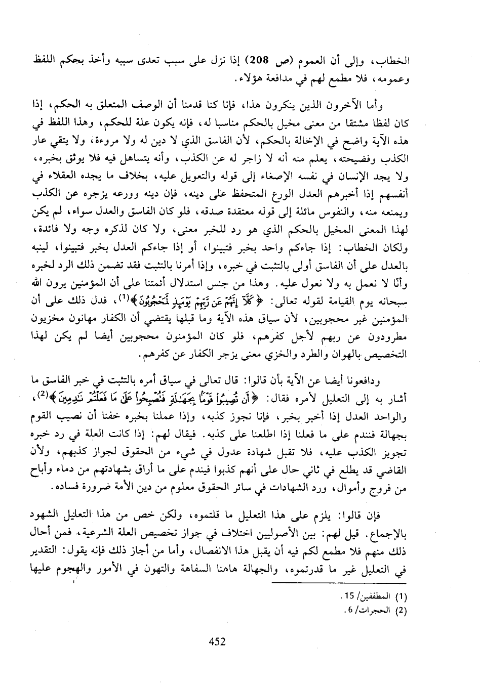 وأما الآخرون الذين ينكرون هذا، فإنا كنا قدمنا أن الوصف المتعلق به الحكم، إذا كان لفظا مشتقا من معنى مخيل بالحكم مناسبا له، فإنه يكون علة للحكم، وهذا اللفظ في هذه الآية واضح في الإخالة بالحكم، لأن الفاسق الذي لا دين له ولا مروءة، ولا يتقي عار الكذب وفضيحته، يعلم منه أنه لا زاجر له عن الكذب، وأنه يتساهل فيه فلا يوثق بخبره، ولا يجد الإنسان في نفسه الإصغاء إلى قوله والتعويل عليه، بخلاف ما يجده العقلاء في أنفسهم إذا أخبرهم العدل الورع المتحفظ على دينه، إنه دينه وروعه يزجره عن الكذب ويمنعه منه، والنفوس مائلة إلى قوله معتقدة صدقه، فلو كان الفاسق والعدل سواء، لم يكن لهذا المعنى المخيل بالحكم الذي هو رد للخبر معنى، ولا كان لذكره وجه ولا فائدة، ولكان الخطاب: إذا جاءكم واحد بخبر فتبينوا، أو إذا جاءكم العدل بخبر فتبينوا، لينبه بالعدل على أن الفاسق أولى بالتثبت في خبره، وإذا أمرنا بالتثبت فقد تضمن ذلك الرد لخبره وأنا لا نعمل به ولا نعول عليه. وهذا من جنس استدلال أئمتنا على أن المؤمنين يرون الله سبحانه يوم القيامة لقوله تعالى: (كلا إنهم عن ربهم يومئذ لمحجوبون)، فدل ذلك على أن المؤمنين غير محجوبين، لأن سياق هذه الآية وما قبلها يقتضي أن الكفار مهانون مخزيون مطردون عن ربهم لأجل كفرهم، فلو كان المؤمنون محجوبين أيضا لم يكن لهذا التخصيص بالهوان والطرد والخزي معنى يزجر الكفار عن كفرهم.