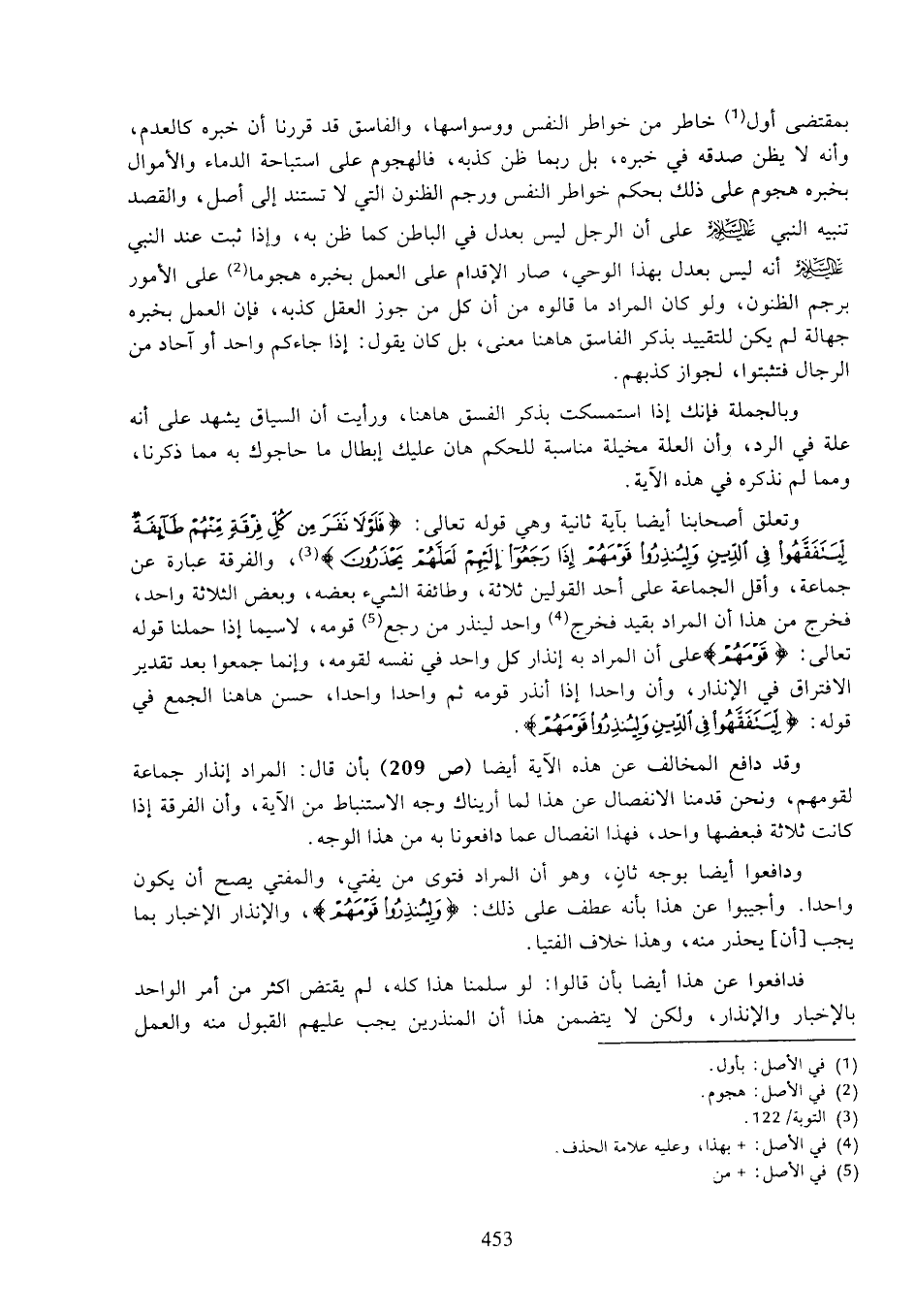 ودافعوا أيضا بوجه ثان، وهو أن المراد فتوى من يفتي، والمفتي يصح أن يكون واحدا. وأجيبوا عن هذا بأنه عطف على ذلك: (ولينذروا قومهم)، والإنذار الإخبار بما يجب [أن] يحذر منه، وهذا خلاف الفتيا.