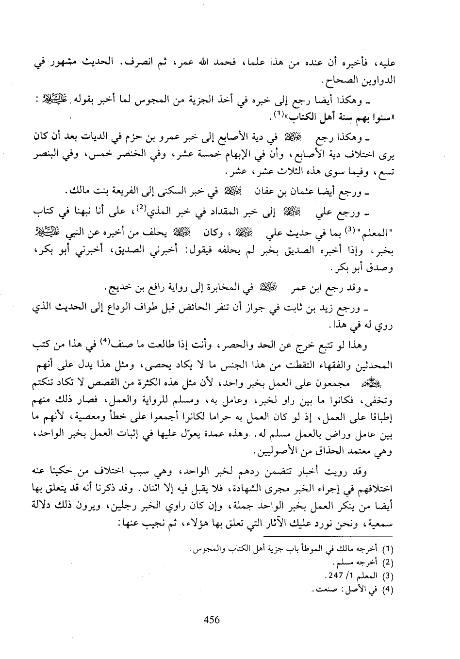 - وهكذا أيضا رجع إلى خبره في أخذ الجزية من المجوس لما أخبر بقوله عليه السلام: "سنوا بهم سنة أهل الكتاب".