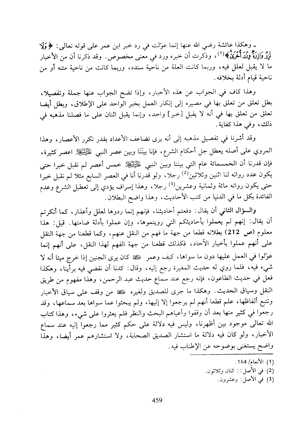 والسؤال الثاني أن يقال: دفعتم أحاديثنا، فإنهم إنما ردوها لعلل وأعذار، كما أنكرتم أن يقال: إنهم لم يعملوا بأحاديثكم التي رويتموها، وإن عملوا بأدلة ضامتها. وقيل: هذا معلوم (ص ٢١٢) بطلانه قطعا من جهة ما فهم من النقل عنهم، وكما قطعنا من جهة النقل على أنهم عملوا بأخبار الآحاد، فكذلك قطعنا من جهة الفهم لهذا النقل، على أنهم إنما عولوا في العمل عليها دون ما سواها، كيف وعمر رضي الله عنه كان يرى الجنين إذا خرج ميتا أنه لا شيء فيه، فلما روي له حديث المغيرة رجع إليه، وقال: كدنا أن نقضي فيه برأينا، وهكذا فعل في حديث الطاعون، فإنه رجع عند سماع حديث عبد الرحمن، وهذا مفهوم من طريق النقل وسياق الحديث. وهكذا ما جرى للصديق ولغيره رضي الله عنه من وقف على سياق الأخبار وتتبع ألفاظها، علم قطعا أنهم لم يرجعوا إلا إليها، ولم يبحثوا عما سواها بعد سماعها، وقد رجعوا في كثير منها بعد أن وقوفا وأعياهم البحث والنظر فلم يعثروا على شيء، وهذا كتاب الله تعالى موجود بني أظهرنا، وليس فيه دلالة على حكم كثير مما رجعوا إليه عند سماع الأخبار، ولو كان فيه دلالة ما استشار الصديق الصحابة، ولا استشارهم عمر أيضا، وهذا واضح يستغنى بوضوحه عن الإطناب فيه.