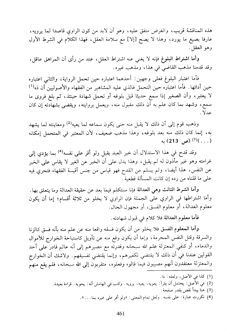 فأما اعتبار البلوغ فعلى وجهين: أحدهما اعتباره حين تحمل الرواية، والثاني اعتباره حين أدائها. فأما اعتباره حين التحمل فالذي عليه المشاهير من الفقهاء والأصوليين أن ذه لا يعتبر، وأن الصغير إذا سمع حديثا قبل بلوغه أو تحمل شهادة حينئذ، ثم بلغ فروى ما سمع، وشهد بما كان علم به أن ذلك مقبول منه، ويعمل بروايته، ويقضي بشهادته إن كان عدلا.