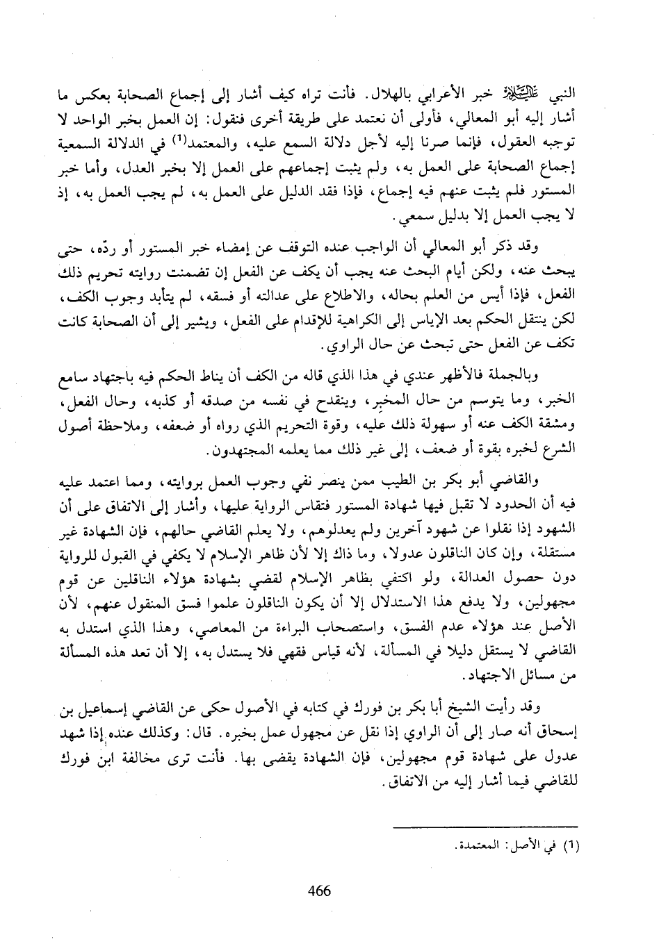 النبي عليه السلام خبر الأعرابي بالهلال. فأنت تراه كيف أشار إلى إجماع الصحابة بعكس ما أشار إليه أبو المعالي، فأولى أن نعتمد على طريقة أخرى فلنقول: إن العمل بخبر الواحد لا توجبه العقول، فإنما صرنا إليه لأجل دلالة السمع عليه، والمعتمد في الدلالة السمعية إجماع الصحابة على العمل به، ولم يثبت إجماعهم على العمل إلا بخبر العدل، وأما خبر المستور فلم يثبت عنهم فيه إجماع، فإذا فقد الدليل على العمل به، لم يجب العمل به، إذ لا يجب العمل إلا بدليل سمعي.