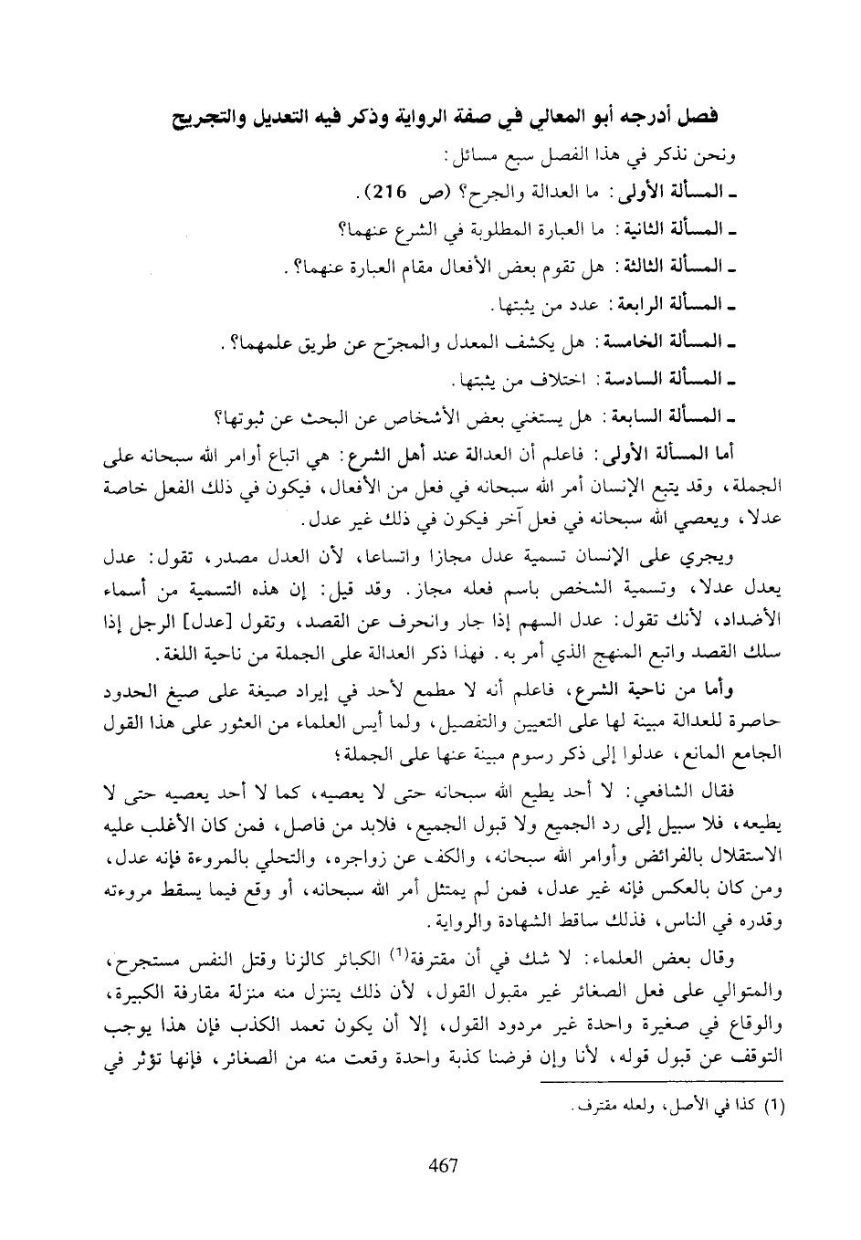 فصل أدرجه أبو المعالي في صفة الرواية وذكر فيه التعديل والتجريح