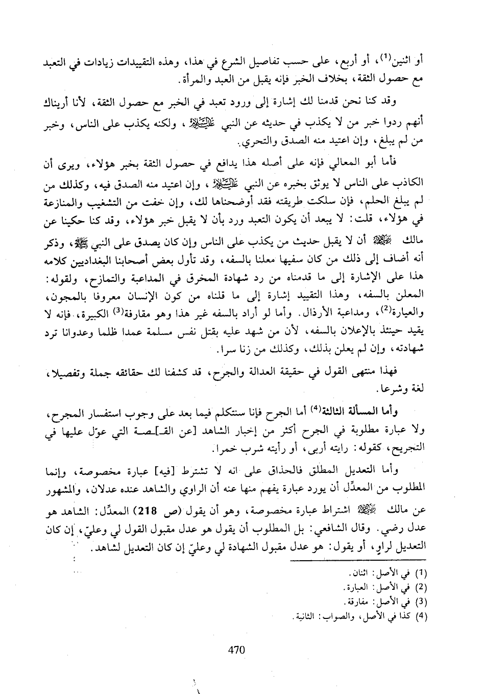 وأما المسألة الثالثة أما الجرح فإنا سنتكلم فيما بعد على وجوب استفسار المجرح، ولا عبارة مطلوبة في الجرح أكثر من إخبار الشاهد [عن القـ]ـصة التي عول عليها في التجريح، كقوله: رأيته أربى، أو رأيته شرب خمرا.
