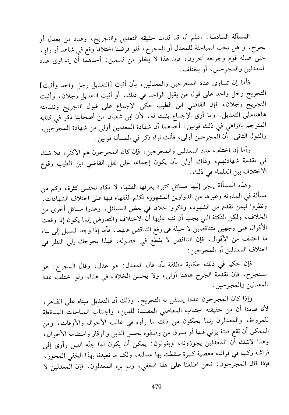 المسألة السادسة: اعلم أنا قد قدمنا حقيقة التعديل والتجريح، وعدد من يعدل أو يجرح، وهل تجب المباحثة للمعدل أو المجرح، فلو فرضنا اختلافا وقع في شاهد أو راوٍ، حتى عدله قوم وجرحه آخرون، فإن هذا لا يخلو من قسمين، أحدهما أن يتساوى عدد المعدلين والمجرحين، أو يختلف.