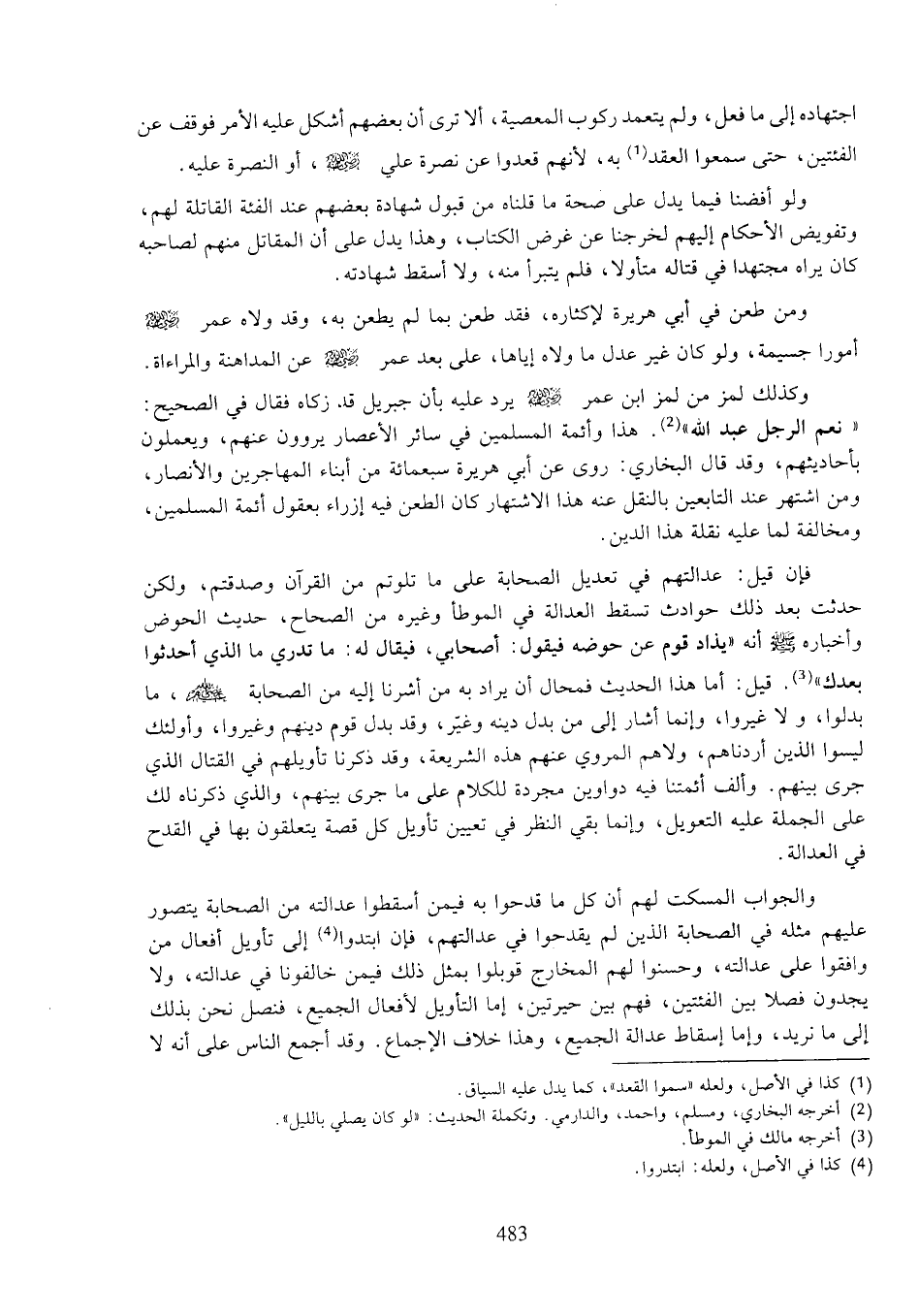 والجواب المسكت لهم أن كل ما قدحوا به فيمن أسقطوا عدالته من الصحابة يتصور عليهم مثله في الصحابة الذين لم يقدحوا في عدالتهم، فإن ابتدوا إلى تأويل أفعال من وافقوا على عدالته، وحسنوا لهم المخارج قوبلوا بمثل ذلك فيمن خالفونا في عدالته، ولا يجدون فصلا بين الفئتين، فهم بين حيرتين، إما التأويل لأفعال الجميع، فنصل نحن بذلك إلى ما نريد، وإما إسقاط عدالة الجميع، وهذا خلاف الإجماع. وقد أجمع الناس على أنه لا