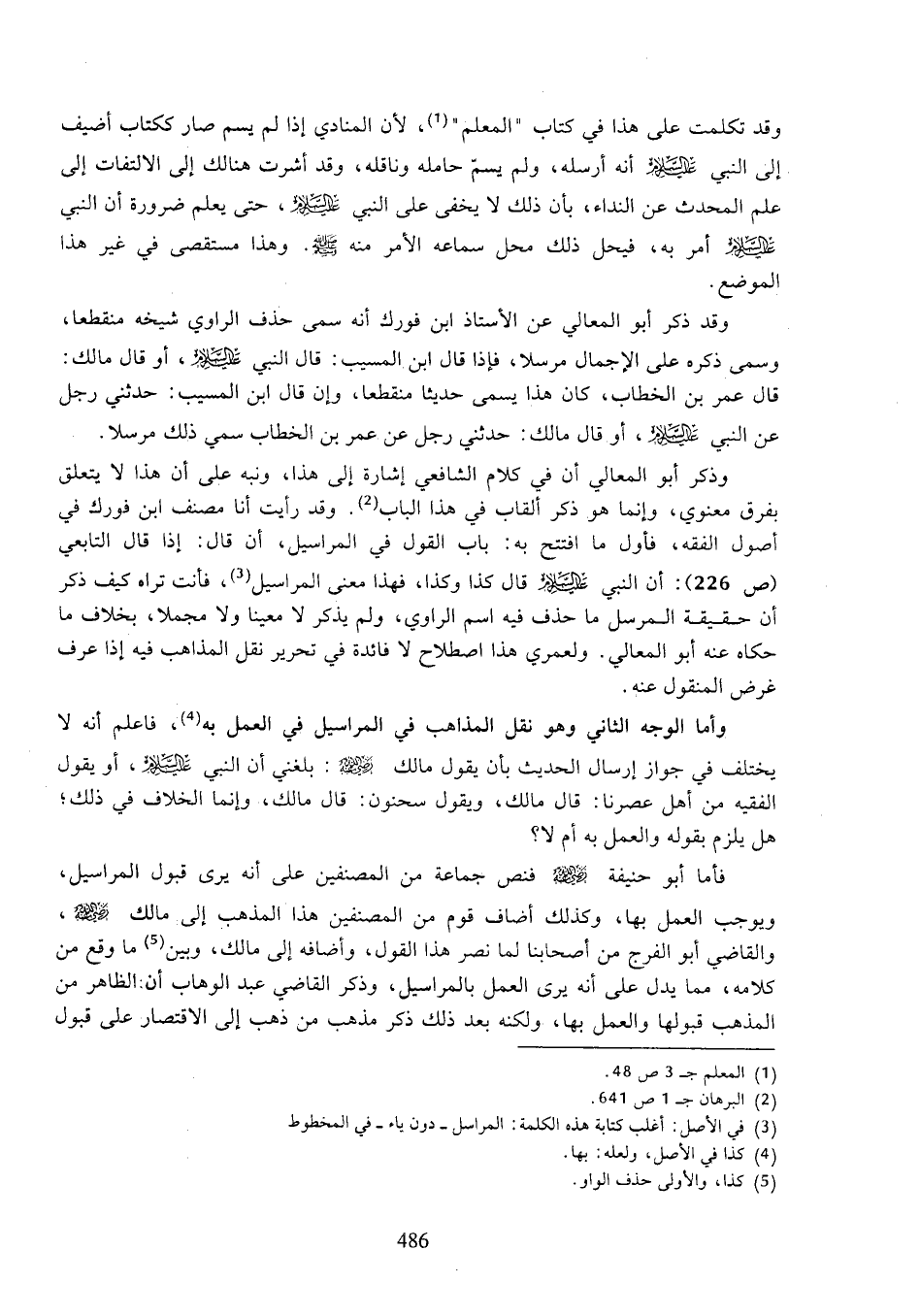 وذكر أبو المعالي أن في كلام الشافعي إشارة إلى هذا، ونبه على أن هذا لا يتعلق بفرق معنوي، وإنما هو ذكر القاب في هذا الباب. وقد رأيت أنا مصنف ابن فورك في أصول الفقه، فأول ما افتتح به: باب القول في المراسيل، أن قال: إذا قال التابعي (ص ٢٢٦): أن النبي عليه السلام قالك كذا وكذا، فهذا معنى المراسيل، فأنت تراه كيف ذكر أن حقيقة المرسل ما حذف فيه اسم الراوي، ولم يذكر لا معينا ولا مجملا، بخلاف ما حكاه عنه أبو المعالي. ولعمري هذا اصطلاح لا فائدة في تحرير نقل المذاهب فيه إذا عرف غرض المنقول عنه.