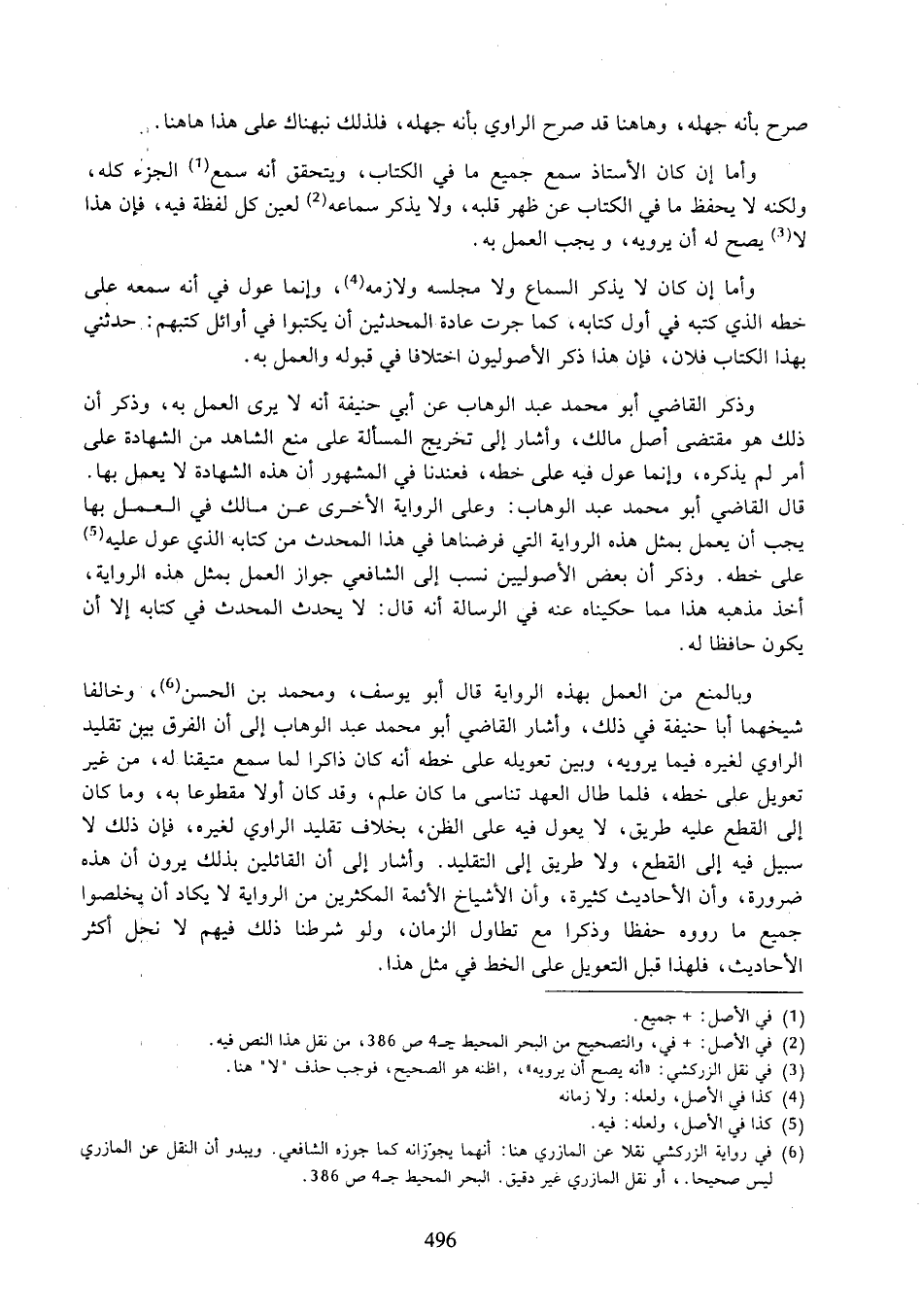 وذكر القاضي أبو محمد عبد الوهاب عن أبي حنيفة أنه لا يرى العمل به، وذكر أن ذلك هو مقتضي أصل مالك، واشار إلى تخريج المسألة على منع الشاهد من الشهادة على أمر لم يذكره، وإنما عول فيه على خطه، فعندنا في المشهور أن هذه الشهادة لا يعمل بها. قال القاضي أبو محد عبد الوهاب: وعلى الرواية الأخرى عن مالك في العمل بها يجب أن يعمل بمثل هذه الرواية التي فرضناها في هذا المحثد من كتابه الذي عول عليه على خطه. وذكر أن بعض الأصوليين نسب إلى الشافعي جواز العمل بمثل هذه الرواية، أخذ مذهبه هذا مما حكيناه عنه في الرسالة أنه قال: لا يحدث المحدث في كتابه إلا أن يكون حافظا له.