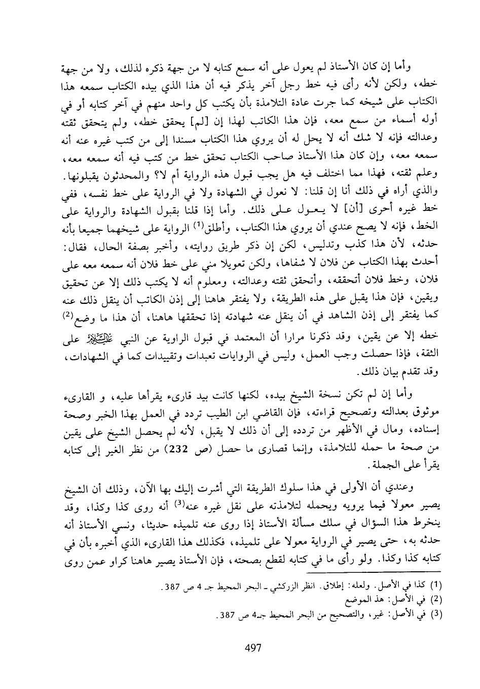 وعندي أن الأولى في هذا سلوك الطريقة التي أشرت إليك بها الآن، وذلك أن الشيخ يصير معولا فيما يرويه ويحمله لتلامذته على نقل غيره عنه أنه روى كذا وكذا، وقد ينخرط هذا السؤال في سلك مسألة الأستاذ إذا روى عنه تلميذه حديثا، ونسي الأستاذ أنه حدثه به، حتى يصير في الرواية معولا على تلميذه، فكذلك هذا القارئ الذي أخبره بأن في كتابه كذا وكذا. ولو رأى ما في كتابه لقطع بصحته، فإن الأستاذ يصير هاهنا كراو عمن روى