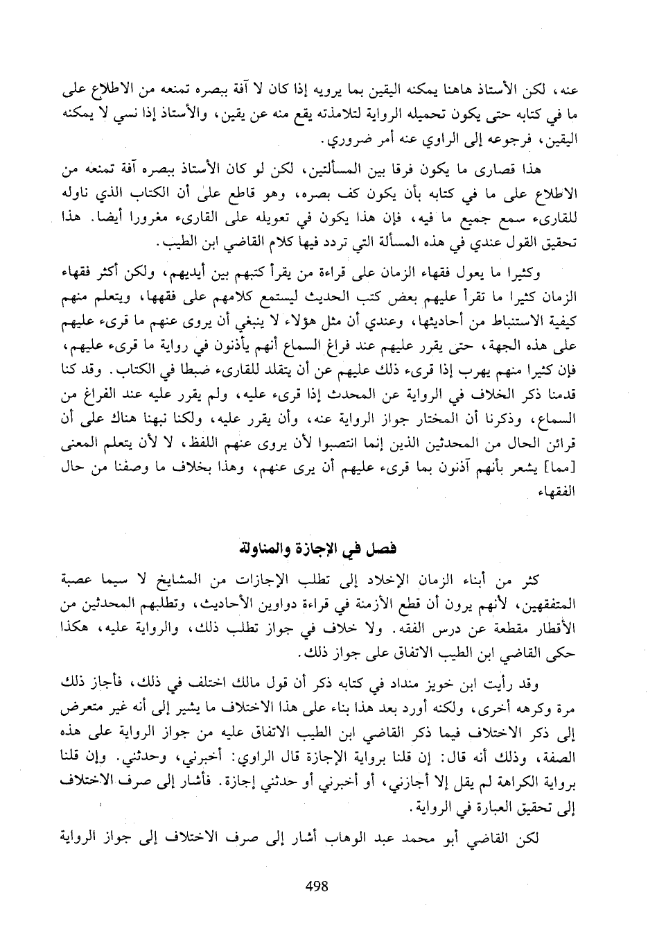 هذا قصارى ما يكون فرقا بين المسألتين، لكن لو كان الأستاذ ببصره آفة تمنعه من الاطلاع على ما في كتابه بأن يكون كف بصره، وهو قاطع على أن الكتاب الذي ناوله للقارئ سمع جميع ما فيه، فإن هذا يكون في تعويله على القارئ مغرورا أيضا. هذا تحقيق القول عندي في هذه المسألة التي تردد فيها كلام القاضي ابن الطيب.