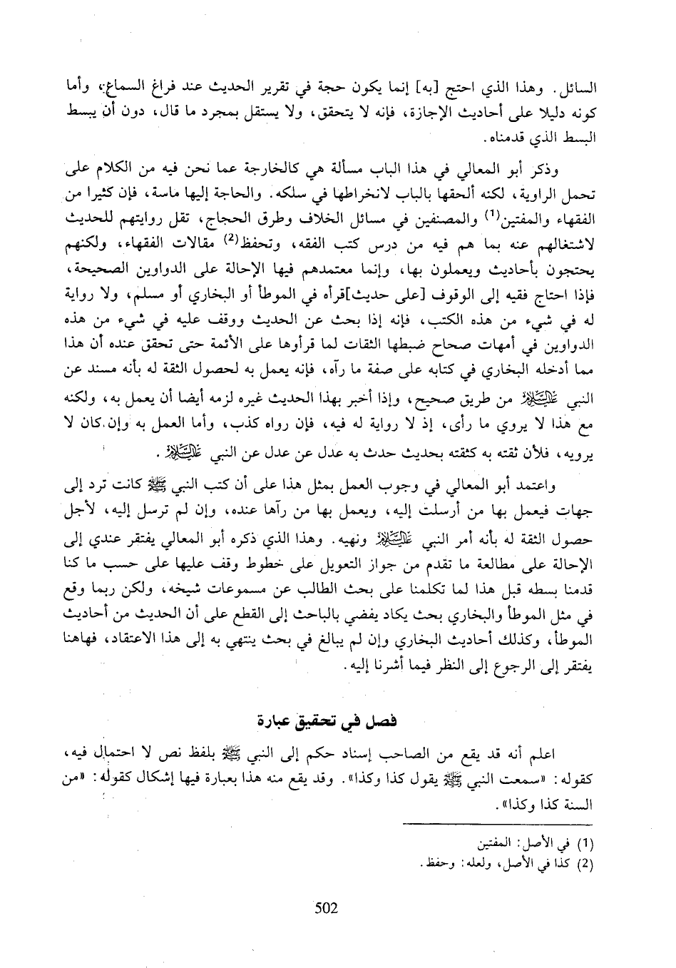 واعتمد أبو المعالي في وجوب العمل بمثل هذا على أن كتب النبي صلى الله عليه وسلم كانت ترد إلى جهات فيعمل بها من أرسلت إليه، ويعمل بها من رآها عنده، وإن لم ترسل إليه، لأجل حصول الثقة له بأنه أمر النبي عليه السلام ونهيه. وهذا الذي ذكره أبو المعالي يفتقر عندي إلى الإحالة على مطالعة ما تقدم من جواز التعويل على خطوط وقف عليها على حسب ما كنا قدمنا بسطه قبل هذا لما تكلمنا على بحث الطالب عن مسموعات شيخه، ولكنه ربما وقع في مثل الموطأ والبخاري بحيث يكاد يفضي بالباحث إلى القطع على أن الحديث من أحاديث الموطأ، وكذلك أحاديث البخاري وإن لم يبالغ في بحث ينتهي به إلى هذا الاعتقاد، فهاهنا يفتقر إلى الرجوع إلى النظر فيما أشرنا إليه.