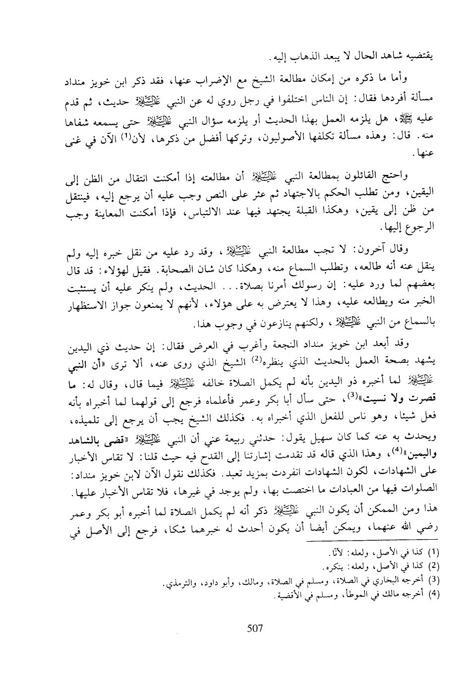 وقال آخرون: لا تجب مطالعة النبي عليه السلام، وقد رد عليه من نقل خبره إليه ولم ينقل عنه أنه طالعه، وتطلب السماع منه، وهكذا كان شأن الصحابة. فقيل لهؤلاء: قد قال بعضهم لما ورد عليه: إن رسولك أمرنا بصلاة ... الحديث، ولم ينكر عليه أن يستثبت الخبر منه ويطالعه عليه، وهذا لا يعترض به على هؤلاء، لأنهم لا يمنعون جواز الاستظهار باسماع من النبي عليه السلام، ولكنهم ينازعون في وجوب هذا.