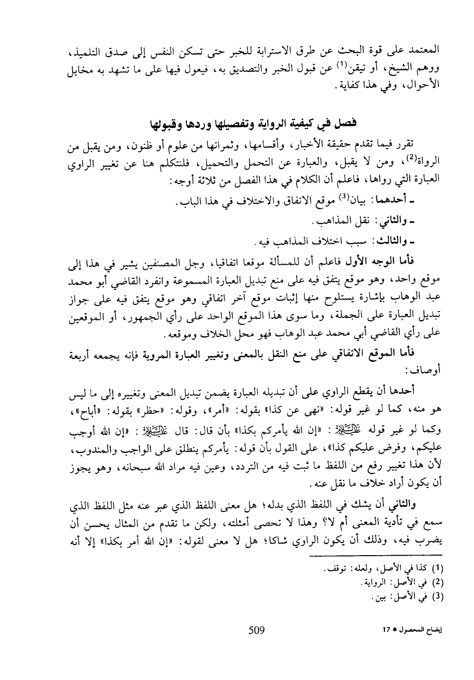 تقرر فيما تقدم حقيقة الأخبار، وأقسامها، وثمراتها من علوم أو ظنون، ومن يقبل من الرواة، ومن لا يقبل، والعبارة عن التحمل والتحميل، فلنتكم هنا عن تغيير الراوي العبارة التي رواها، فاعلم أن الكلام في هذا الفصل من ثلاثة أوجه: