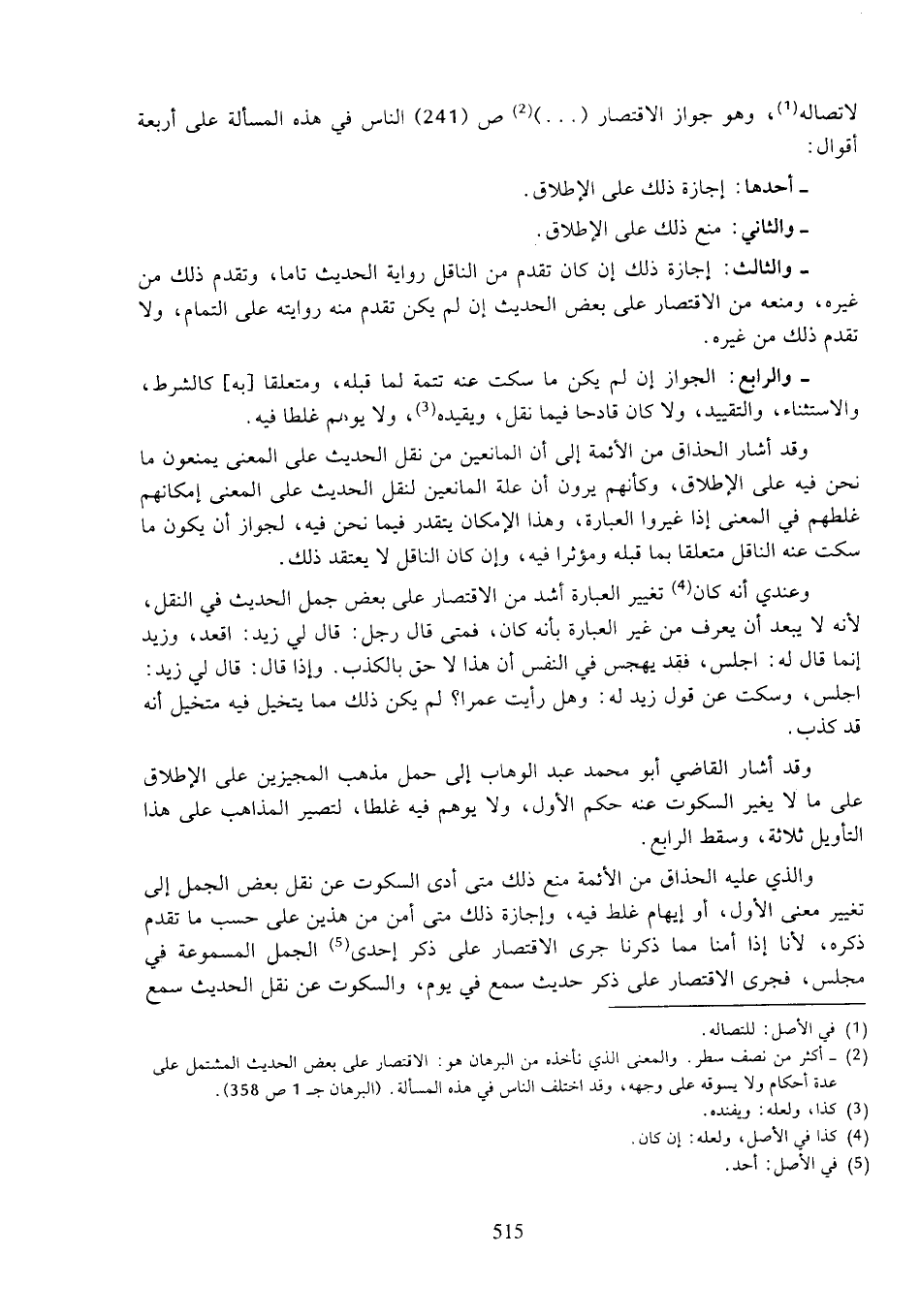 وقد أشار الحذاق من الأئمة إلى أن المانعين من نقل الحديث على المعنى يمنعون ما نحن فيه على الإطلاق، وكأنهم يرون أن علة المانعين لنقل الحديث على المعنى إمكانهم غلطهم في المعنى إذا غيروا العبارة، وهذا الإمكان يتقدر فيما نحن فيه، لجواز أن يكون ما سكت عنه الناقل متعلقا بما قبله ومؤثرا فيه، وإن كان الناقل لا يعتقد ذلك.