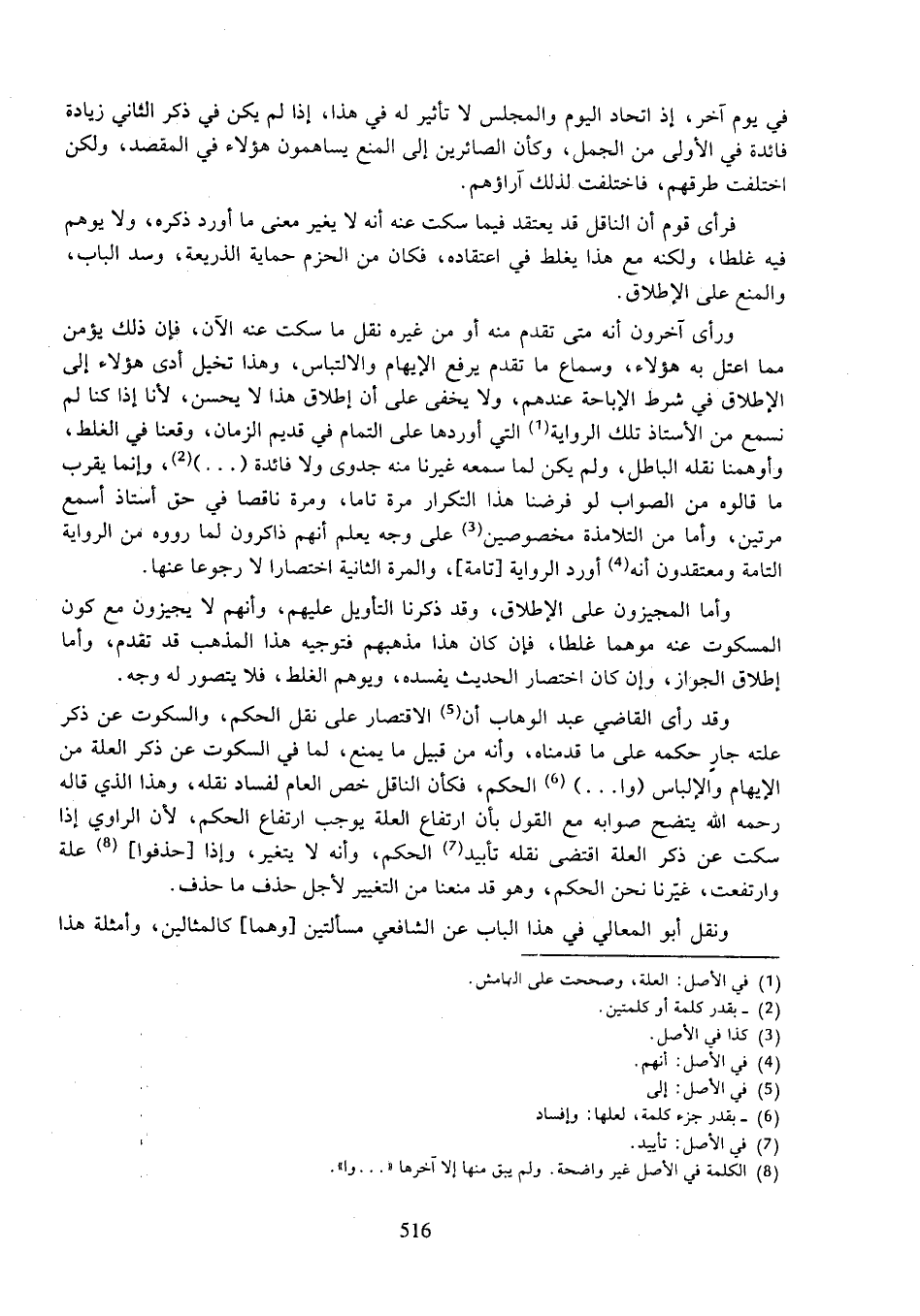 ورأى آخرون أنه متى تقدم منه أو من غيره نقل ما سكت عنه الآن، فإن ذلك يؤمن مما اعتل به هؤلاء، وسماع ما تقدم يرفع الإيهام والالتباس، وهذا تخيل أدى هؤلاء إلى الإطلاق في شرط الإباحة عندهم، ولا يخفى على أن إطلاق هذا لا يحسن، لأنا إذا كنا لم نسمع من الأستاذ تلك الرواية التي أوردها على التمام في قديم الزمان، وقعنا في الغلط، وأوهمنا نقله الباطل، ولم يكن لما سمعه غيرنا منه جدوى ولا فائدة (...)، وإنما يقرب ما قالوه من الصواب لو فرضنا هذا التكرار مرة تاما، ومرة ناقصا في حق أستاذ أسمع مرتين، وأما من التلامذه مخصوصين على وجه يعلم أنهم ذاكرون لما رووه من الرواية التامة ومعتقدون أنه أورد الرواية [تامة]، والمرة الثانية اختصارا لا رجوعا عنها.