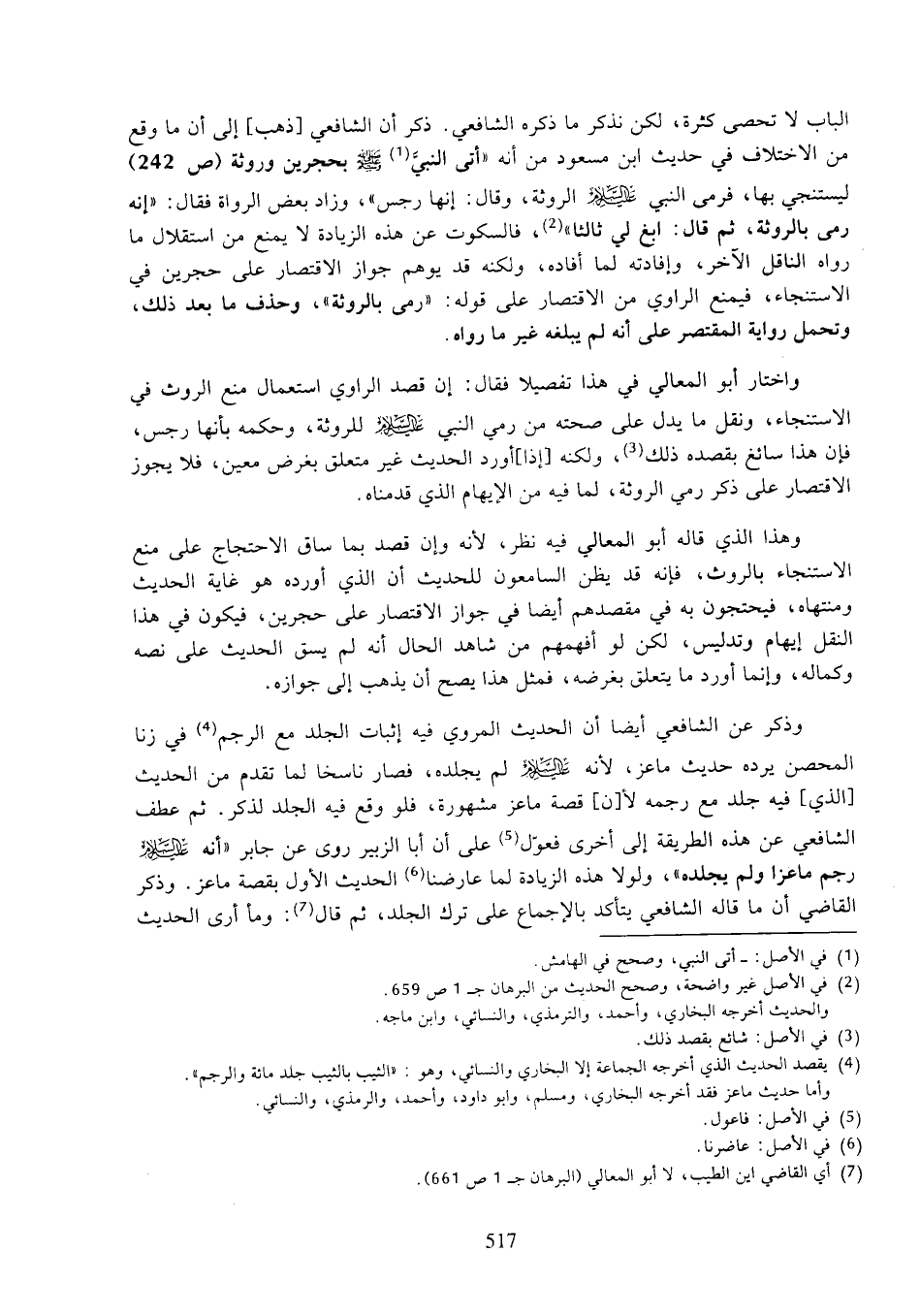 وهذا الذي قاله أبو المعالي فيه نظر، لأنه وإن قصد بما ساق الاحتجاج على منع الاستنجاء بالروث، فإنه قد يظن السامعون للحديث أن الذي أورده هو غاية الحديث ومنتهاه، فيحتجون به في مقصدهم أيضا في جواز الاقتصار على حجرين، فيكون في هذا النقل إيهام وتدليس، لكن لو أفهمهم من شاهد الحال أنه لم يسق الحديث على نصه وكماله، وإنما أورد ما يتعلق بغرضه، فمثل هذا يصح أن يذهب إلى جوازه.