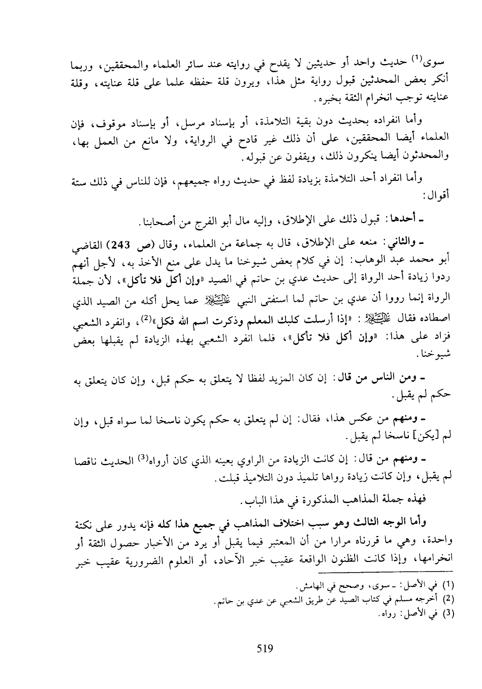 - والثاني: منعه على الإطلاق، قال به جماعة من العلماء، وقال (ص ٢٤٣) القاضي أبو محمد عبد الوهاب: إن في كلام بعض شيوخنا ما يدل على منع الأخذ به، لأجل أنهم ردوا زيادة أحد الرواة إلى حديث عدي بن حاتم في الصيد "وإن أكل فلا تأكل"، لأن جملة الرواة إنما رووا أن عدي بن حاتم لما استفتى النبي عليه السلام عما يحل أكله من الصيد الذي اصطاده فقال عليه السلام: "إذا أرسلت كلبك المعلم وذكرت اسم الله فكل"، وانفرد الشعبي فزاد على هذا: "وإن أكل فلا تأكل"، فلما انفرد الشعبي بهذه الزيادة لم يقبلها بعض شيوخنا.