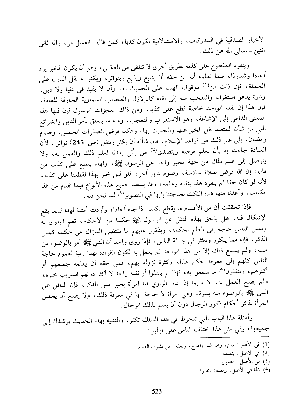 وينفرد المقطوع على كذبه بطريق أخرى لا تتلقى من العكس، وهو أن يكون الخبر يرد آحادا وشذوذا، فيما نعلمه أنه من حقه أن يشيع ويذيع ويتواتر، ويكثر له نقل الدول على الجملة، فإن ذلك من موقوف الهمم على الحديث به، وأن لا يفيد في دنيا ولا دين، وتارة يدعو استغرابه والتعجب منه إلى نقله كالزلازل والعجائب السماوية الخارقة للعادة، فإن هذا إن نقله الواحد خاصة قطع على كذبه، ومن ذلك معجزات الرسول فإن فيها هذا المعنى الداعي إلى الإشاعة، وهو الاستغراب والتعجب، ومنه ما يتعلق بأمر الدين والشرائع التي من شأن المتعبد نقل الخبر عنها والحديث بها، وهكذا فرض الصلوات الخمس، وصوم رمضان، إلى غير ذلك من قواعد الإسلام، فإن شأنه أن يكثر وينقل (ص ٢٤٥) تواترا، لأن العبادة جاءت به بأن يعلم فرضه ويتصدى من يأتي بعدنا لعلم ذلك والعمل به، ولا يتوصل إلى علم ذلك من جهة مخبر واحد عن الرسول صلى الله عليه وسلم، ولهذا يقطع على كذب من قال: إن الله فرض صلاة سادسة، وصوم شهر آخر، فلو قيل خبر بهذا لقطعنا على كذبه، لأنه لو كان حقا لم ينفرد هذا بنقله وعلمه، وقد بسطنا جميع هذا الأنواع فيما تقدم من هذا الكتاب، وأعدنا منها هذه النكتب لحاجتنا إليها في التصوير لما نحن فيه.