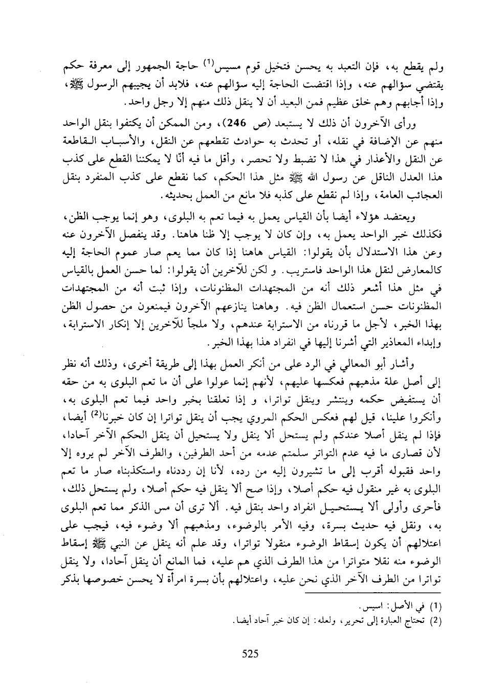 ورأى الآخرون أن ذلك لا يستبعد (ص ٢٤٦)، ومن الممكن أن يكتفوا بنقل الواحد منهم عن الإضافة في نقله، أو تحدث به حوادث تقطعهم عن النقل، والأساب القاطعة عن النقل والأعذار في هذا لا تضبط ولا تحصر، وأقل ما فيه أنا لا يمكننا القطع على كذب هذا العدل الناقل عن رسول الله صلى الله عليه وسلم مثل هذا الحكم، كما نقطع على كذب المنفرد بنقل العجائب العامة، وإذا لم نقطع على كذبه فلا مانع من العمل بحديثه.