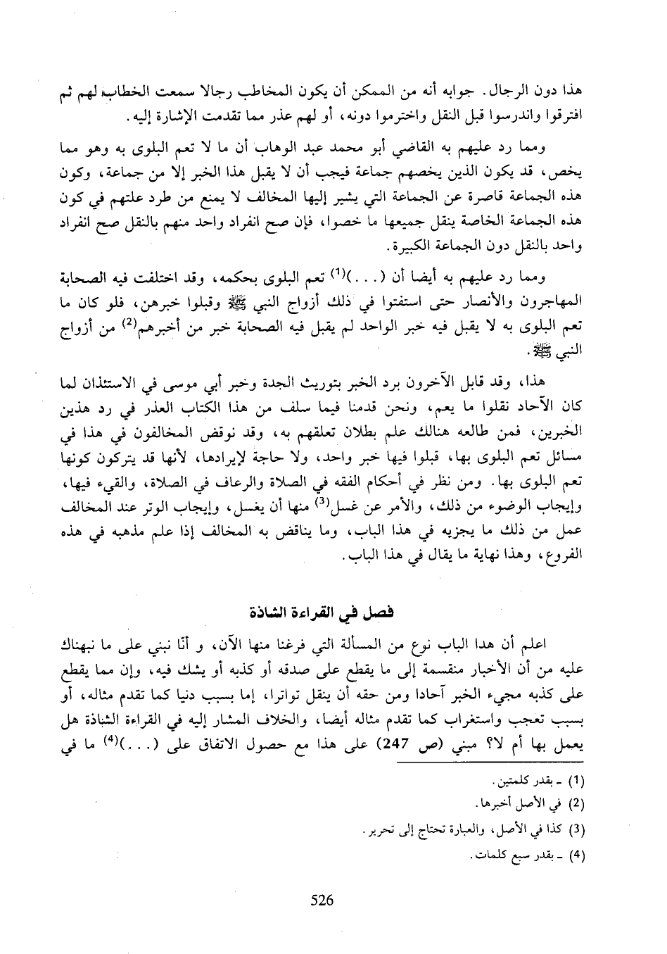 ومما رد عليهم به القاضي أبو محمد عبد الوهاب أن ما لا تعم البلوى به وهو مما يخص، قد يكون الذين يخصهم جماعة فيجب أن لا يقبل هذا الخبر إلا من جماعة، وكون هذه الجماعة قاصرة عن الجماعة التي يشير إليها المخالف لا يمنع من طرد علتهم في كون هذه الجماعة الخاصة ينقل جميعها ما خصوا، فإن صح انفراد واحد منهم بالنقل صح انفراد واحد بالنقل دون الجماعة الكبيرة.