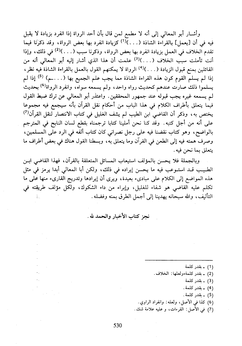 وأشار أبو المعالي إلى أنه لا مطمع لمن قال بأن أحد الرواة إذا انفرد بزيادة لا يقبل فيه في أن [يعمل] بالقراءة الشاذة (...) كزيادة انفرد بها بعض الرواة، وقد ذكرنا فيما تقدم الخلاف في العمل بزيادة انفرد بها بعض الرواة، وذكرنا سبب (...) في ذلك، وإذا أنت تأملت سبب الخلاف (...) علمت أن هذا الذي أشار إليه أبو المعالي أنه من القائلين بمنع قبول الزيادة (...) الرواة لا يمكنهم القول بالعمل بالقراءة الشاذة فيه نظر، إذا لم يسلم القوم كون هذه القراءة الشاذة مما يجب علم الجميع بها (... ـم) إذا لم يسلموا ذلك صارت عندهم كحديث رواه واحد، ولم يسمعه سواه، وانفرد الرواة بحديث ليم يسمعه غيره يجب قبوله عند جمهور المحققينن. واعتذر أبو المعالي عن ترك ضبط القول فيما يتعلق بأطراف الكلام في هذا الباب من أحكام نقل القرآن بأنه سيجمع فيه مجموعا يختص به، وذكر أن القاضي ابن الطيب لم يشف الغليل في كتاب الانتصار لنقل القرآن على أنه من أجل كتبه. وقد كنا نحن أملينا كتابا ترجمناه بقطع لسان النابح في المترجم بالواضح، وهو كتاب نقضنا فيه على رجل نصراني كان كتاب ألفه في الرد على المسلمين، وصرف همته فيه إلى الطعن في القرآن وما يتعلق به، وبسطنا القول هناك في بعض أطراف ما يتعلق بما نحن فيه.