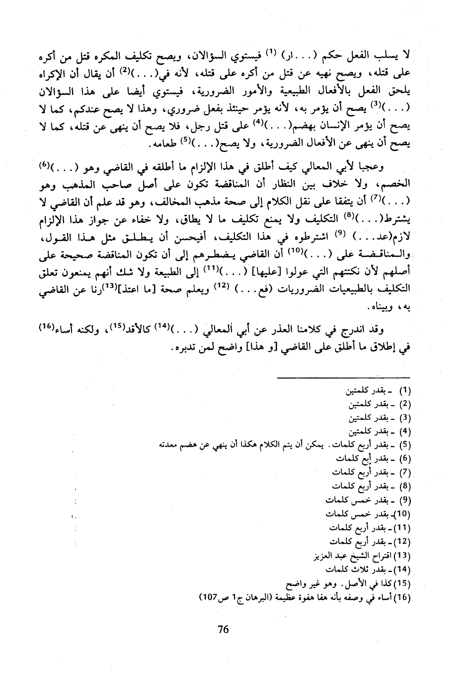 وعجبا لأبي المعالي كيف أطلق في هذا الإلزام ما أطلقه في القاضي وهو (...) الخصم، ولا خلاف بين النظار أن المناقضة تكون على أصل صاحب المذهب وهو (...) أن يتفقا على نقل الكلام إلى صحة مذهب المخالف، وهو قد علم أن القاضي لا يشترط (...) التكليف ولا يمنع تكليف ما لا يطاق، ولا خفاء عن جواز هذا الإلزام لازم (عد ...) اشترطوه في هذا التكليف، أفيحسن أن يطلق مثل هذا القول، ولامناقضة على (...) أن القاضي يضطرهم إلى أن تكون المناقضة صحيحة على أصلهم لأن نكتتهم التي عولوا [عليها] (...) إلى الطبيعة ولا شك أنهم يمنعون تعلق التكليف بالطبيعات الضروريات (فع ...) ويعلم صحة [ما اعتذ] رنا عن القاضي به، وبيناه.