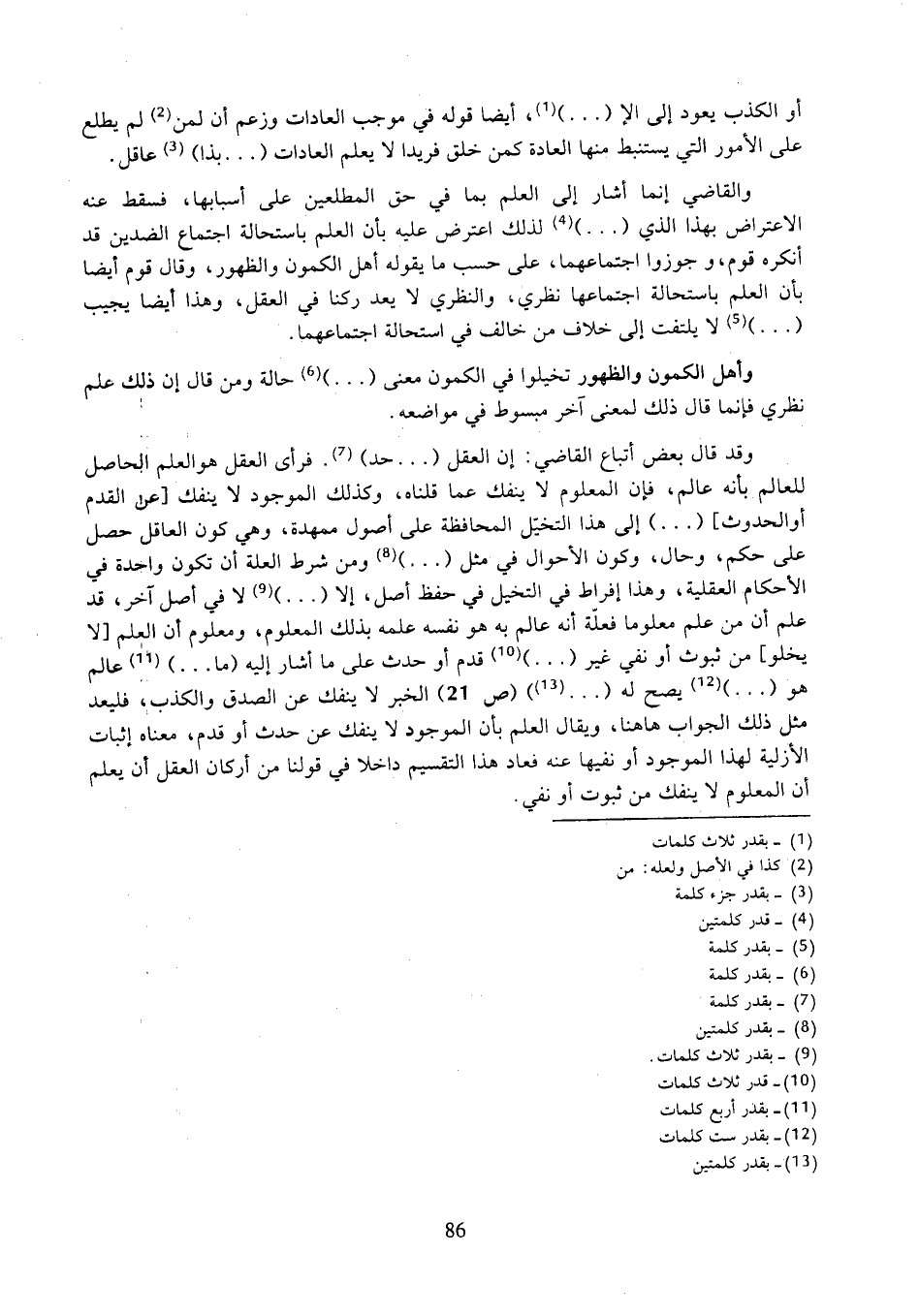 أو الكذب يعود إلا (...)، أيضًا قوله في موجب العادات وزعم أن لمن لم يطلع على الأمور التي يستنبط منها العادة كمن خلق فريدا لا يعلم العادات (... بذا) عاقل.