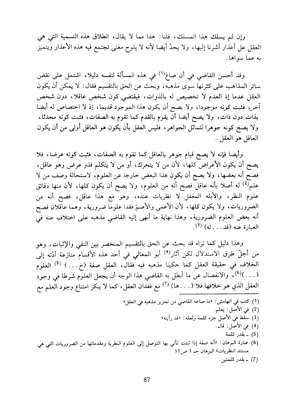 وهذا دليل كما تراه قد بحث عن الحق بالتقسيم المنحصر بين النفي والإثبات، وهو من أجل طرق الاستدلال لكن أثار أبو المعالي في أحد هذه الأقسام منازعه أدته إلى الخلاف في حقيقة العقل كما حكينا مذهبه فيه فقال، العقل صفة (خ ...) العلوم (...)، والانفصال عن ما أبطل به القاضي هذا الوجه أن يجعل العلوم شرطا في وجود العقل الذي هو خلافها فلا (... ها) مع فقدان العقل، كما لا ينكر امتناع وجود العلم مع