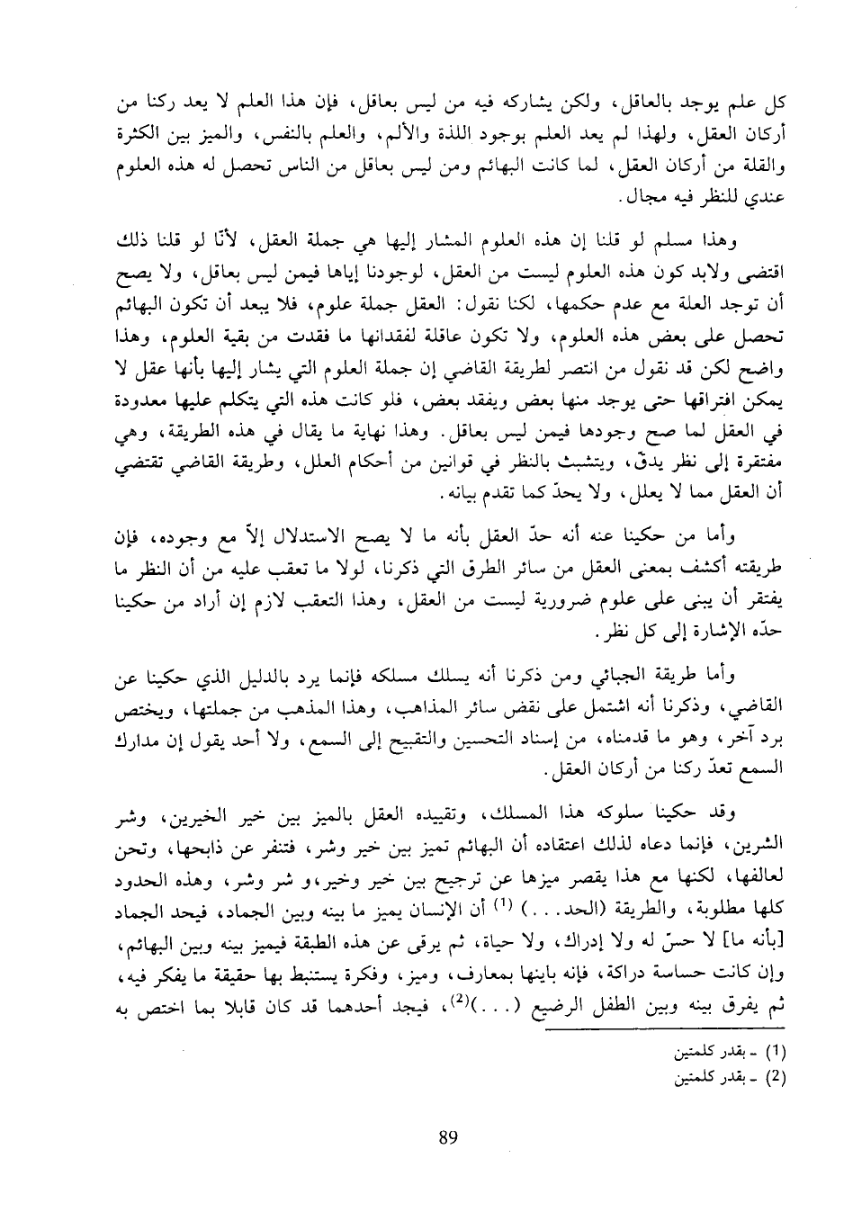 وقد حكينا سلوكه هذا المسلك، وتقييده العقل بالميز بين خير الخيرين، وشر الشرين، فإنما دعاه لذلك اعتقاده أن البهائم تميز بين خير وشر، فتنفر عن ذابحها، وتحن لعالفها، لكنها مع هذا يقصر ميزها عن ترجيح بين خير وخير، وشر وشر، وهذه الحدود كلها مطلوبة، والطريقة (الحد ...) أن الإنسان يميز ما بينه وبين الجماد، فيحد الجماد [بأنه ما] لا حس له ولا إدراك، ولا حياة، ثم يرقى عن هذه الطبقة فيميز بينه وبين البهائم، وإن كانت حساسة دراكة، فإنه باينها بمعارف، وميز، وفكرة يستنبط بها حقيقة ما يفكر فيه، ثم يفرق بينه وبين الطفل الرضيع (...)، فيجد أحدهما قد كان قابلا بما اختص به