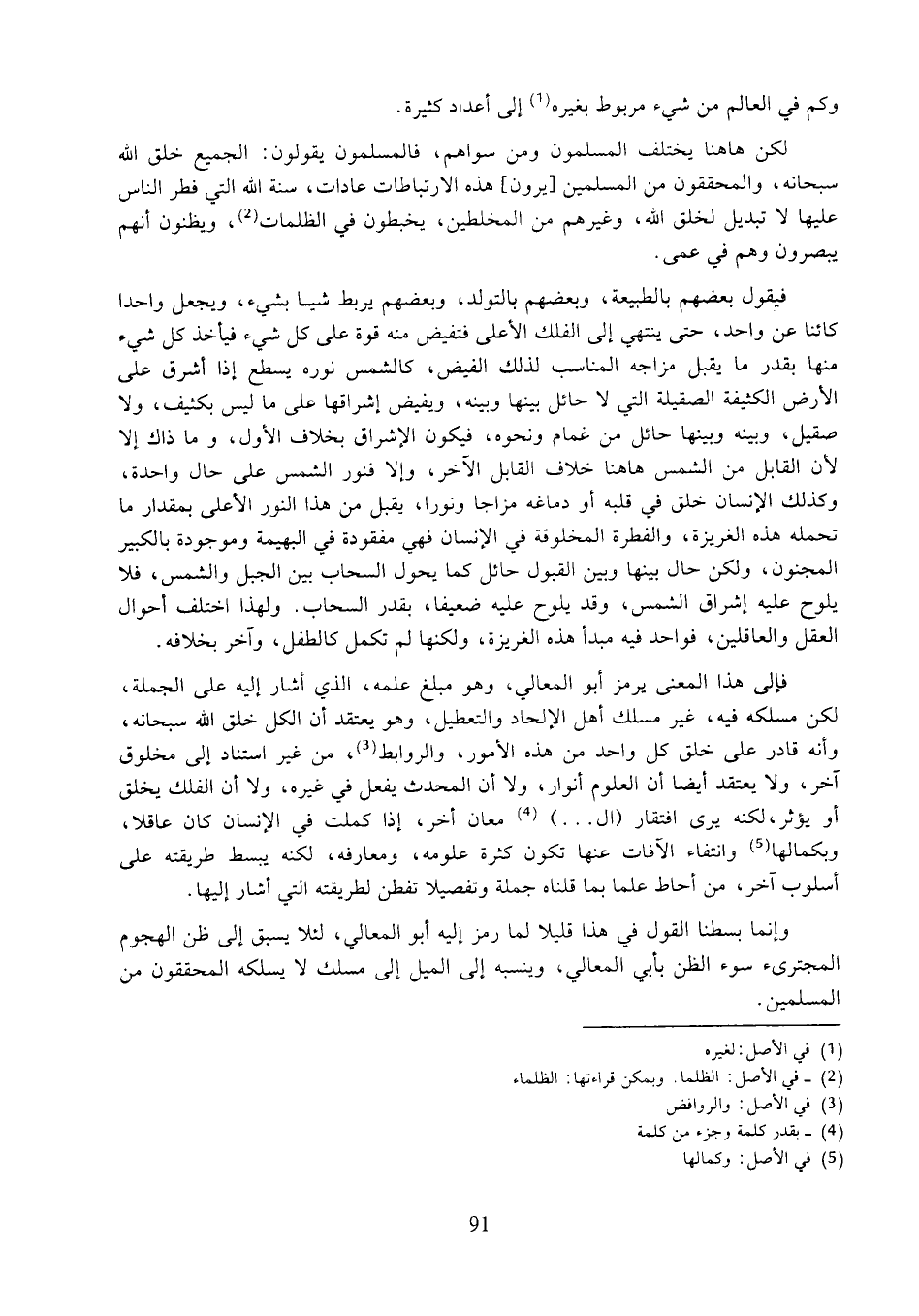 فإلى هذا المعنى يرمز أبو المعالي، وهو مبلغ علمه، الذي أشار إليه على الجملة، لكن مسلكه فيه، غير مسلك أهل الإلحاد والتعطيل، وهو يعتقد أن الكل خلق الله سبحانه، وأنه قادر على خلق كل واحد من هذه الأمور، والروابط، من غير استناد إلى مخلوق آخر، ولا يعتقد أيضًا أن العلوم أنوار، ولا أن المحدث يفعل في غيره، ولا أن الفلك يخلق أو يؤثر، لكنه يرى افتقار (ال ...) معان أخر، إذا كملت في الإنسان كان عاقلا، وبكمالها وانتفاء الآفات عنها تكون كثرة علومه، ومعارفه، لكنه يبسط طريقته على أسلوب آخر، من أحاط علما بما قلناه جملة وتفصيلا تفطن لطريقته التي أشار إليها.