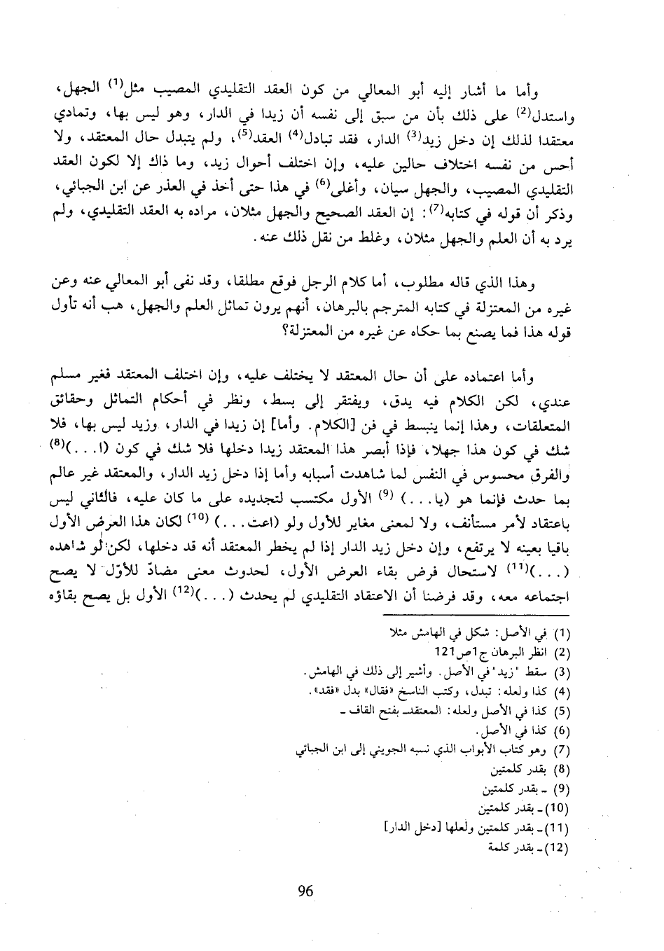 وأما ما أشار إليه أبو المعالي من كون العقد التقليدي المصيب مثل الجهل، واستدل على ذلك بأن من سبق إلى نفسه أن زيدا في الدار، وهو ليس بها، وتمادي معتقدا لذلك إن دخل زيد الدار، فقد تبادل العقد، ولم يتبدل حال المعتقد، ولا أحس من نفسه اختلاف حالين عليه، وإن اختلف أحوال زيد، وما ذاك إلا لكون العقد التقليدي المصيب، والجهل سيان، وأغلى في هذا حتى أخذ في العذر عن ابن الجبائي، وذكر أن قوله في كتابه: إن العقد الصحيح والجهل مثلان، مراده به العقد التقليدي، ولم يرد به أن العلم والجهل مثلان، وغلط من نقل ذلك عنه.